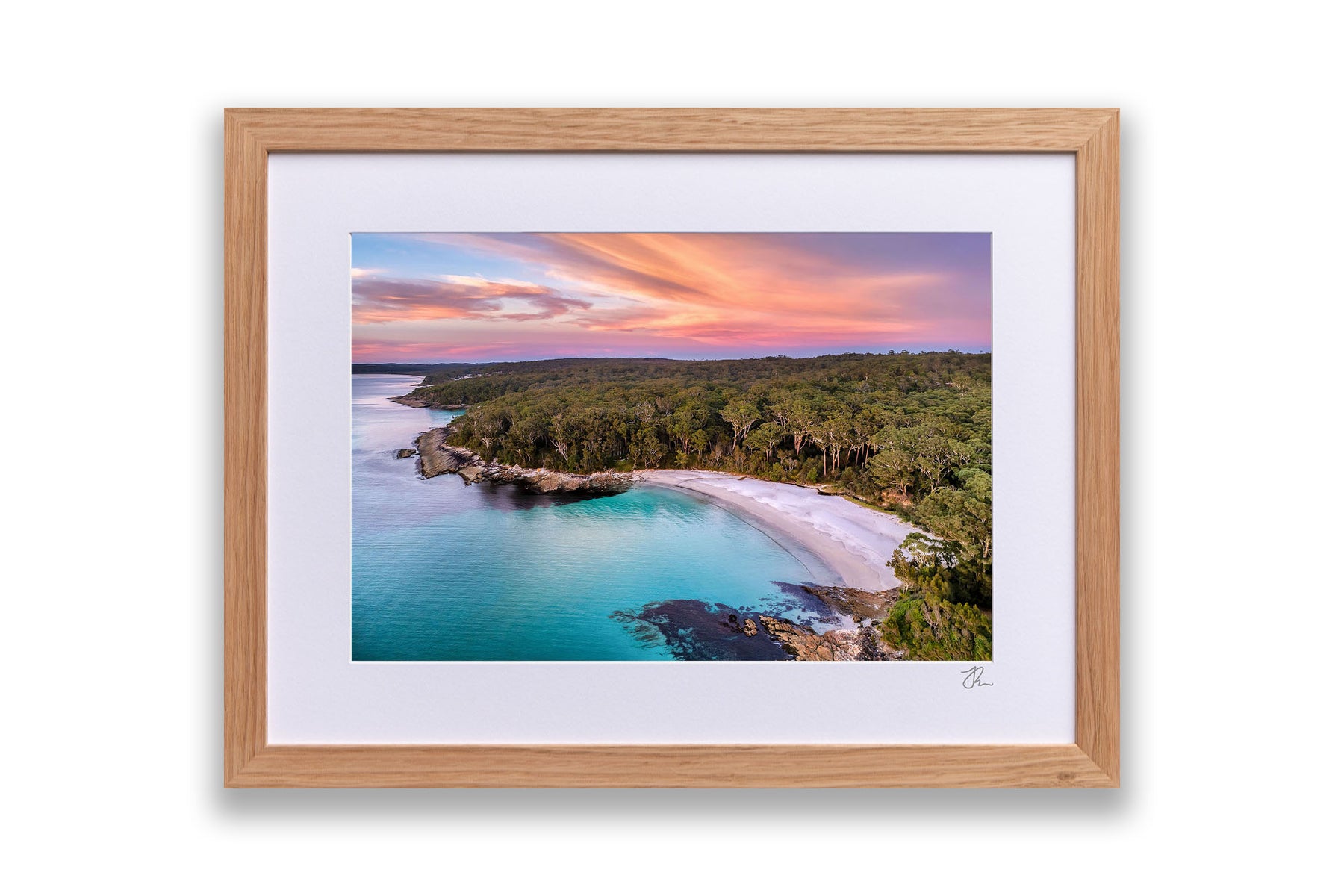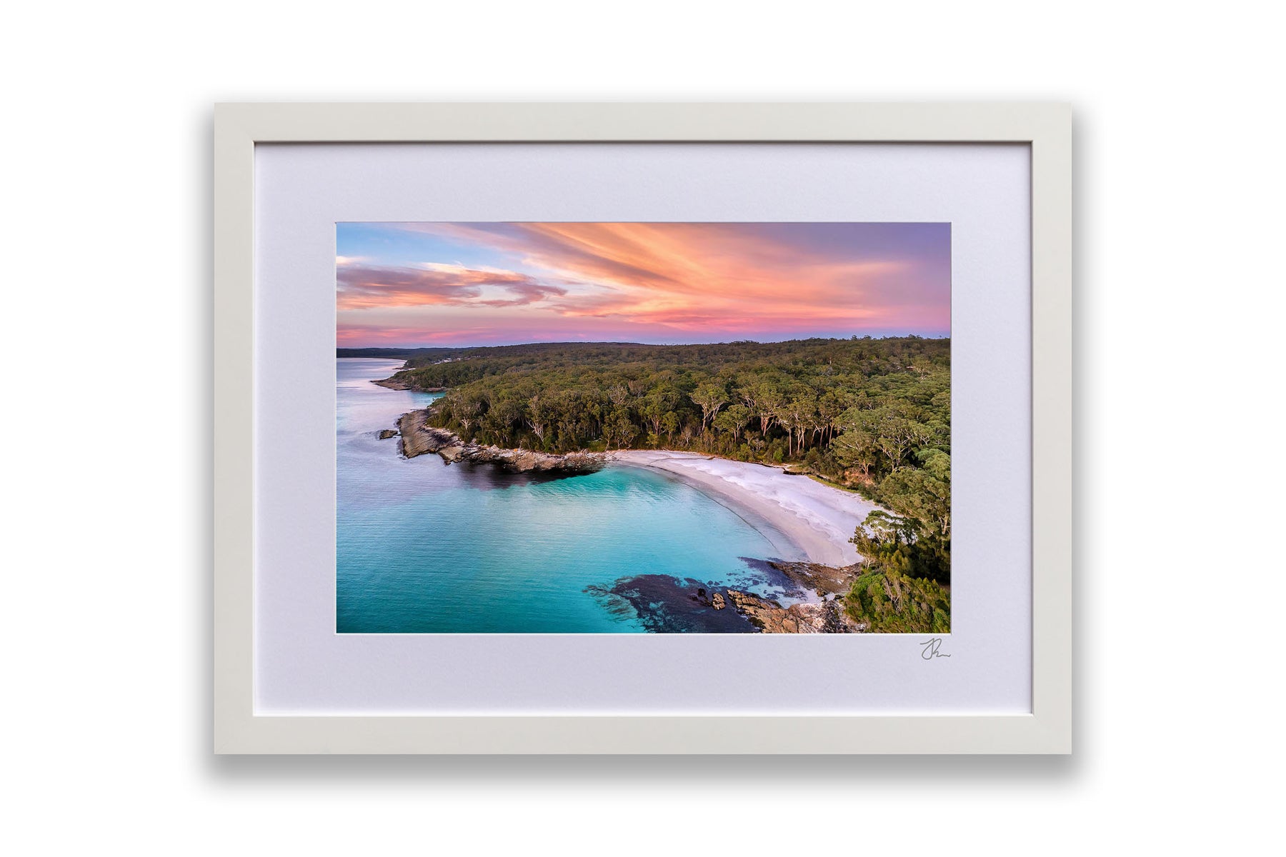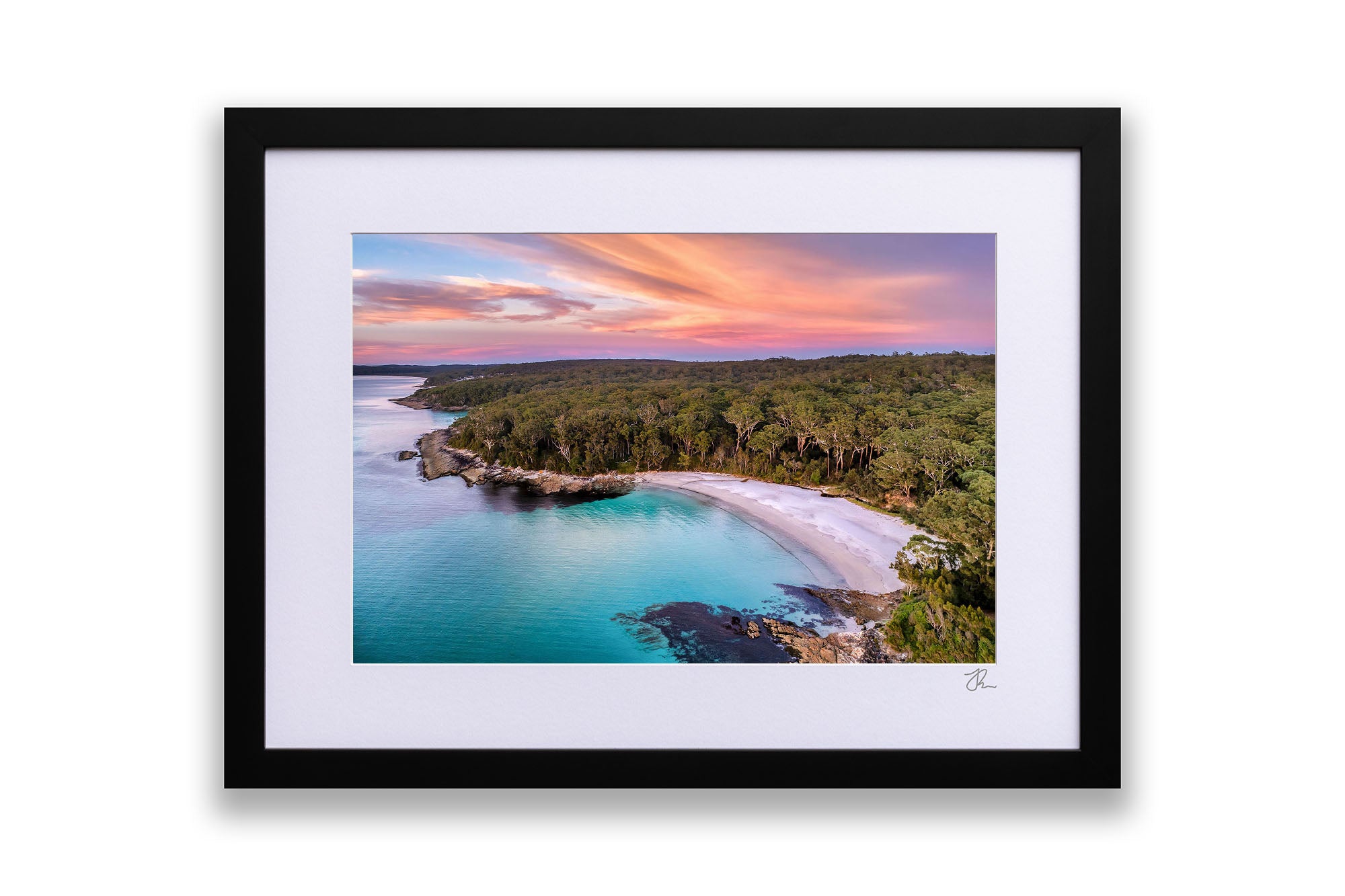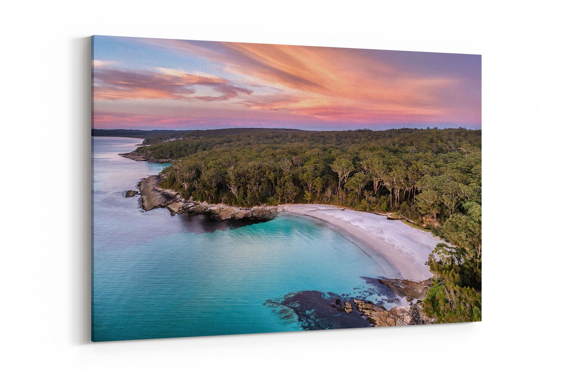 Bring the beauty of Blenheim Beach in Vincentia, Jervis Bay, into your home with this stunning aerial photo print. Capturing the breathtaking vivid sunrise over the sparkling white sands and turquoise waters of one of the most picturesque beaches on the New South Wales South Coast. This fine art print is perfect for nature lovers and coastal decor enthusiasts. The soft hues of dawn and tranquil waters make this image a timeless addition to any space, creating a serene atmosphere in your home or office.