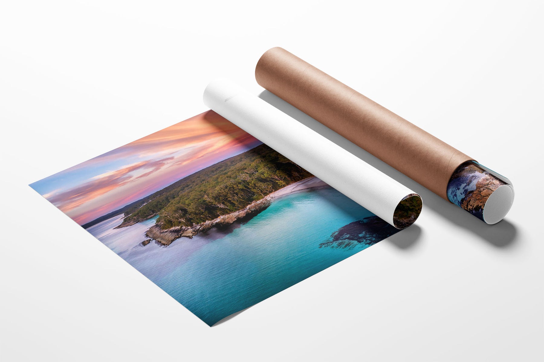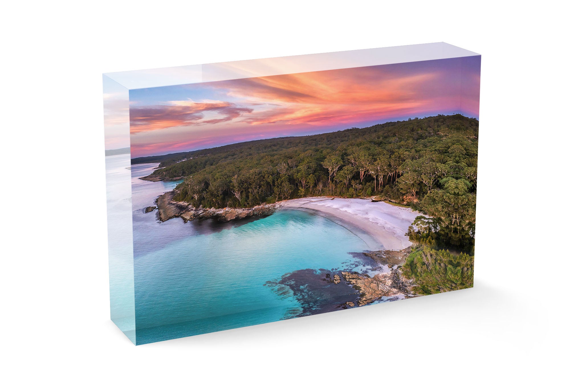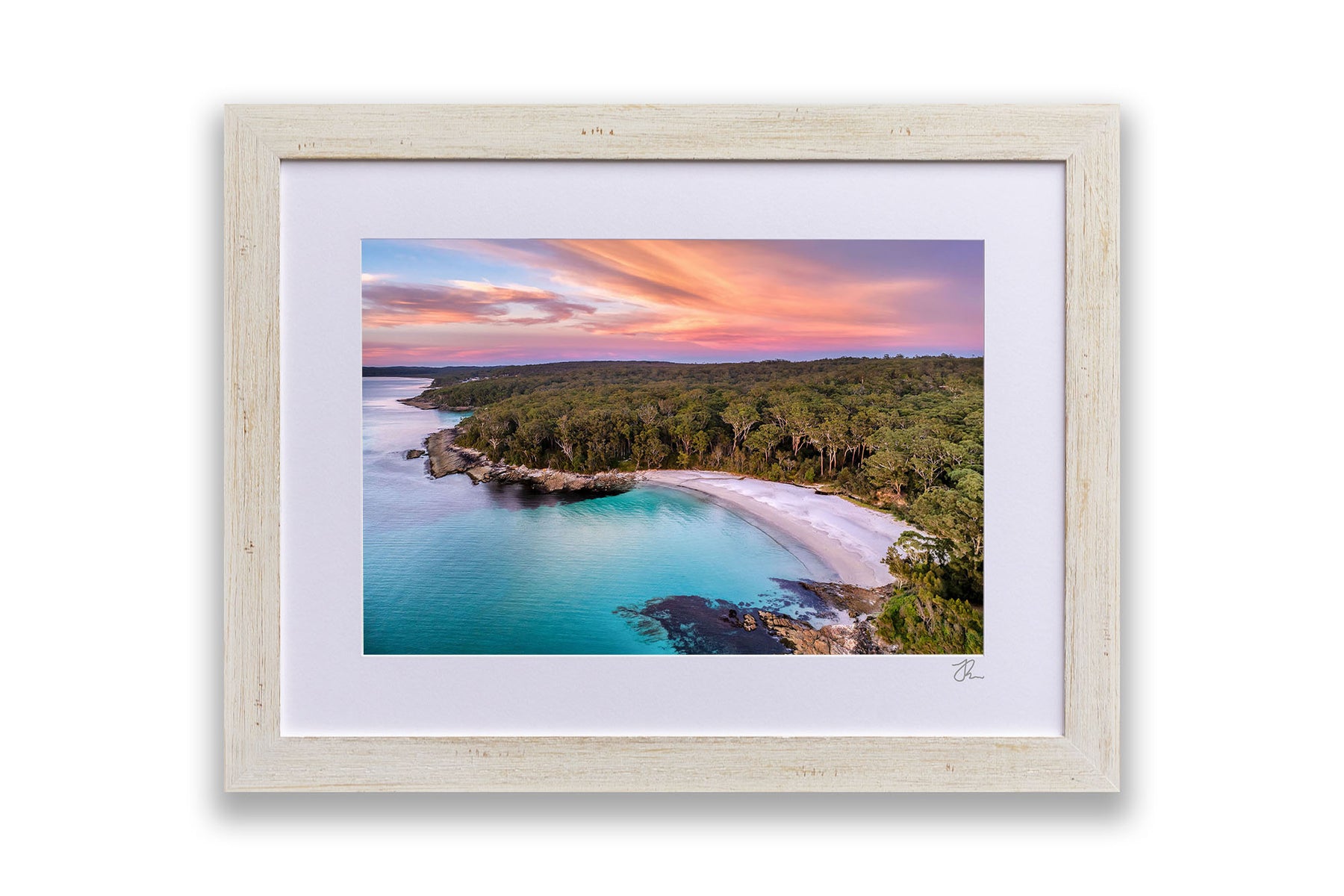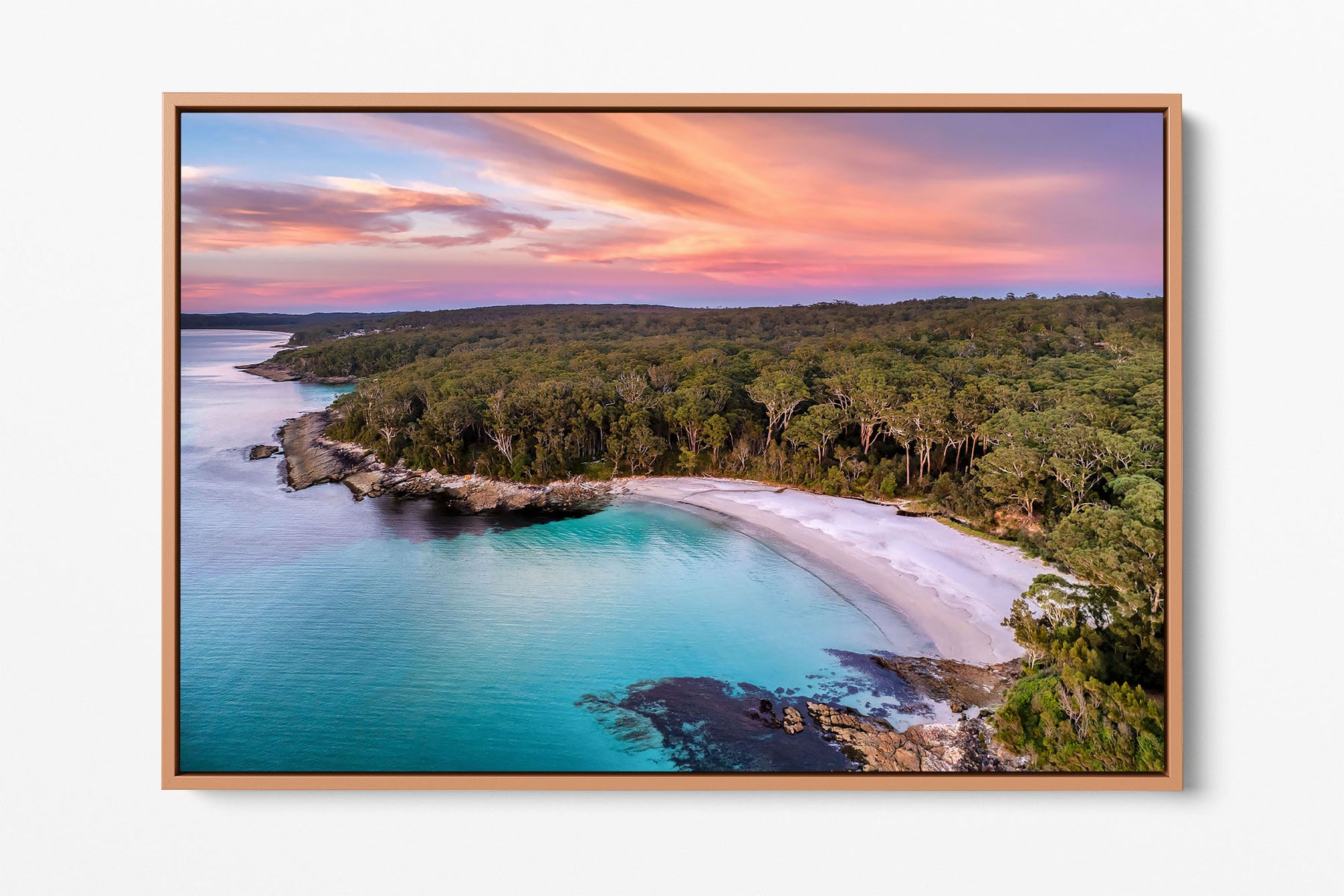 Bring the beauty of Blenheim Beach in Vincentia, Jervis Bay, into your home with this stunning aerial photo print. Capturing the breathtaking vivid sunrise over the sparkling white sands and turquoise waters of one of the most picturesque beaches on the New South Wales South Coast. This fine art print is perfect for nature lovers and coastal decor enthusiasts. The soft hues of dawn and tranquil waters make this image a timeless addition to any space, creating a serene atmosphere in your home or office.