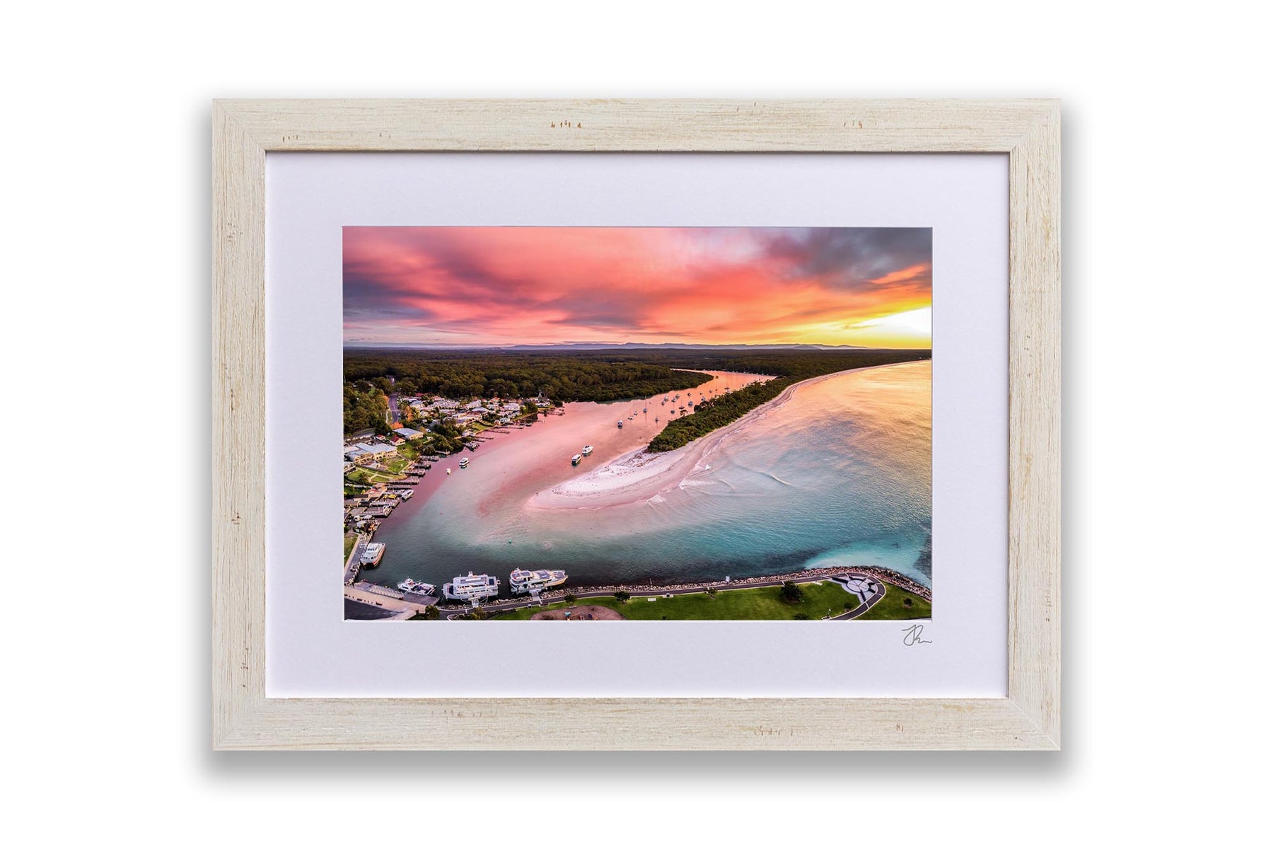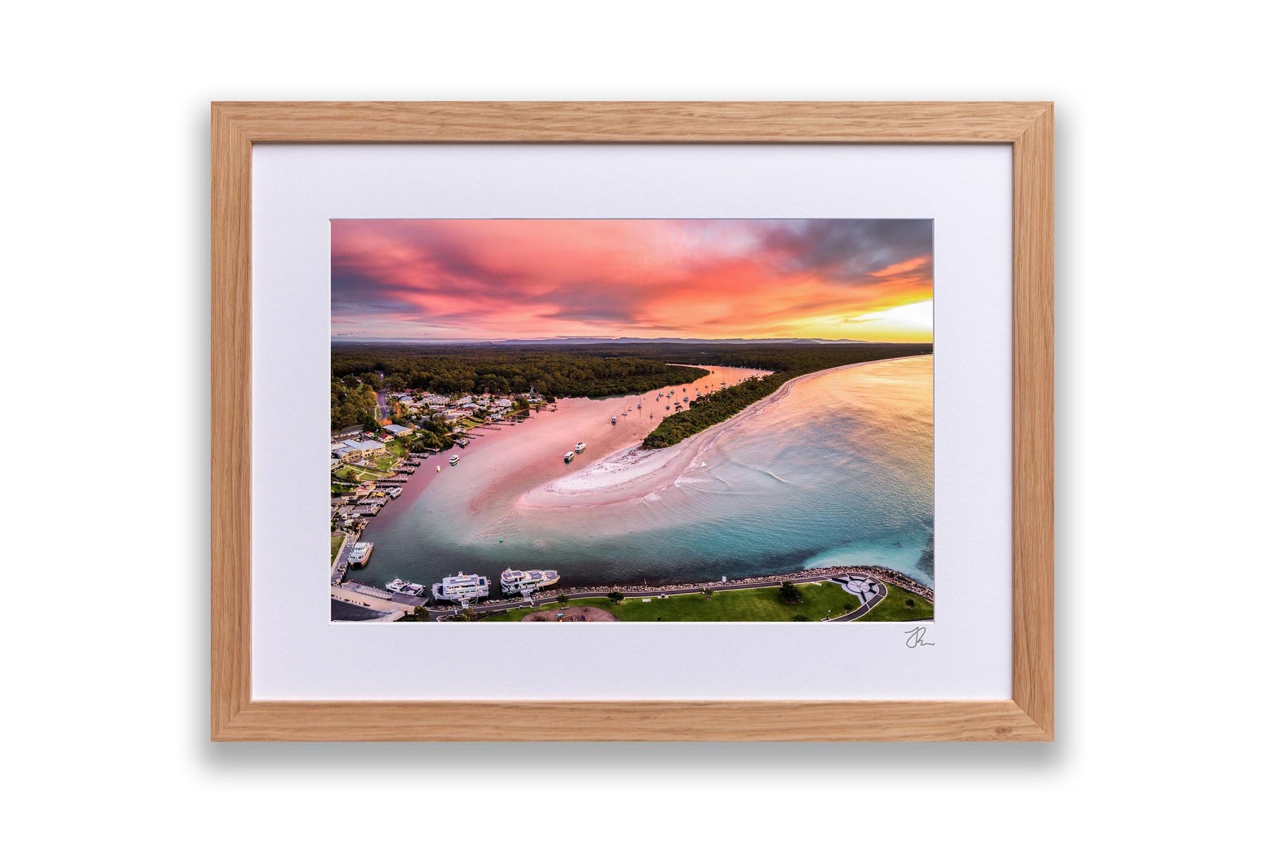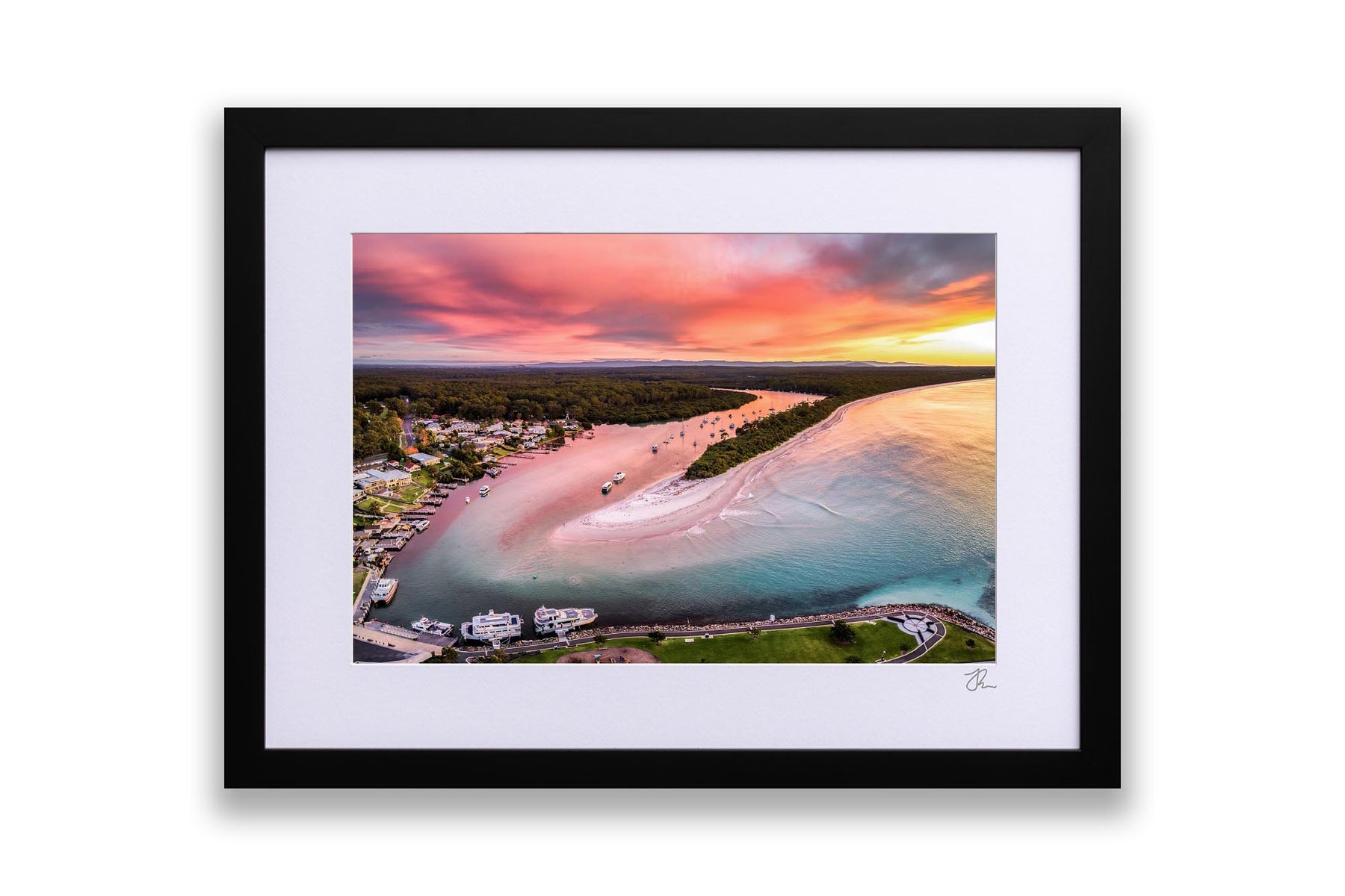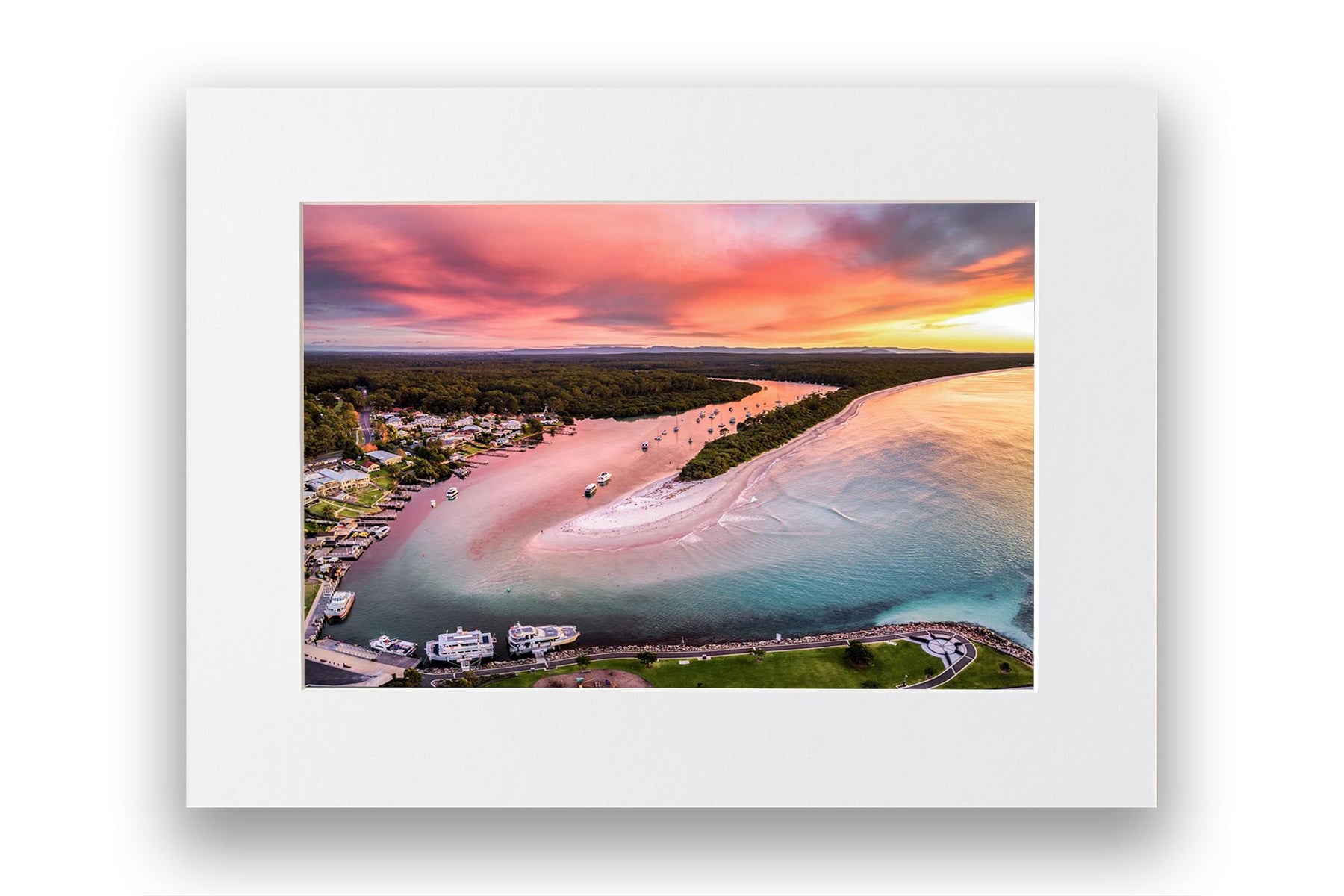Photo print of an aerial view of a vivid sunrise over Currambene Creek and Myola in Huskisson, the entrance to Jervis Bay.