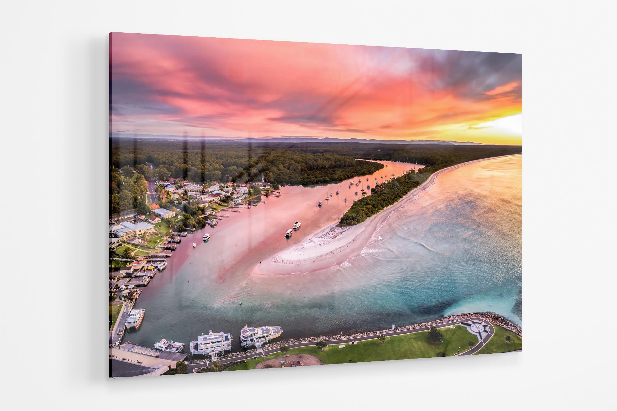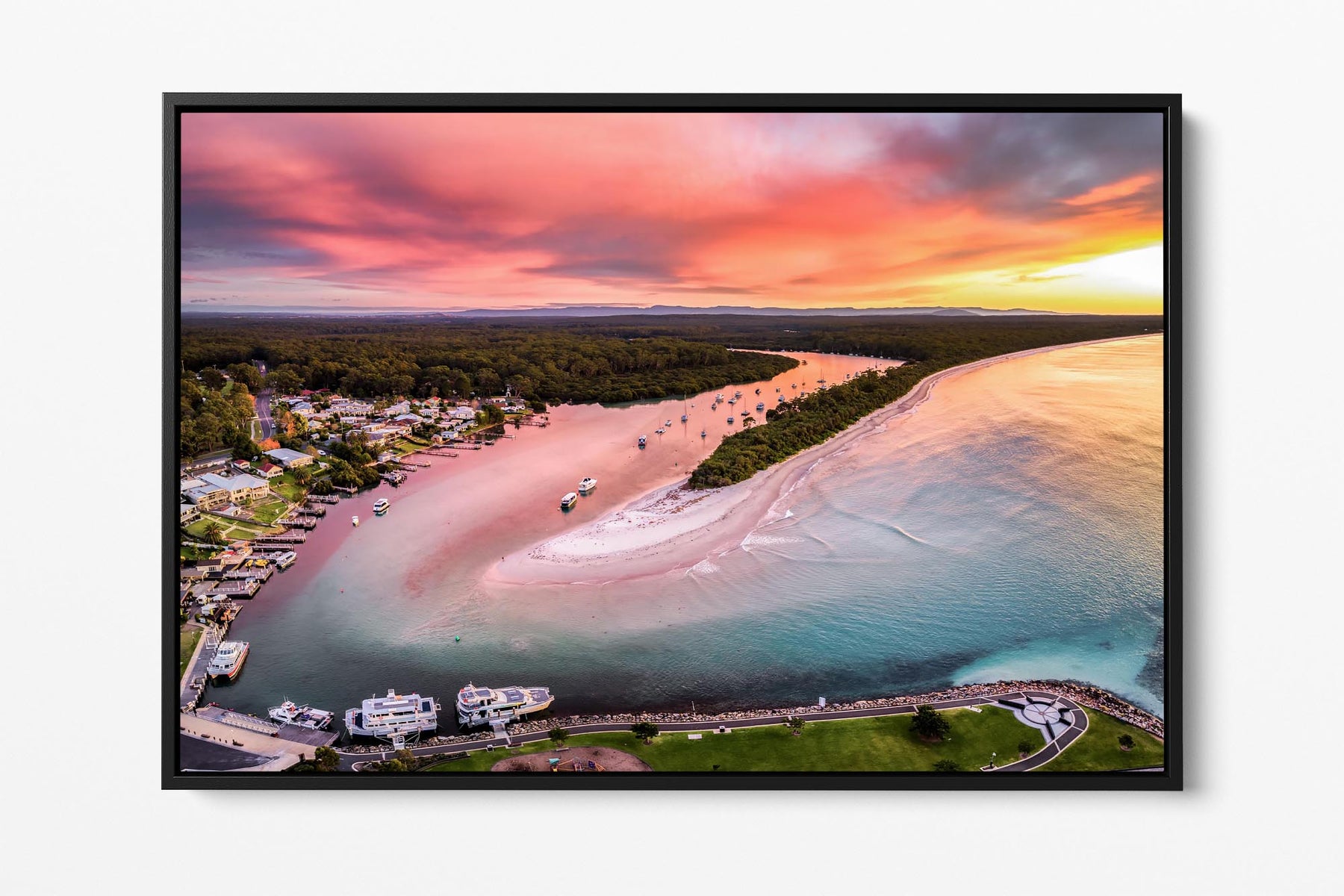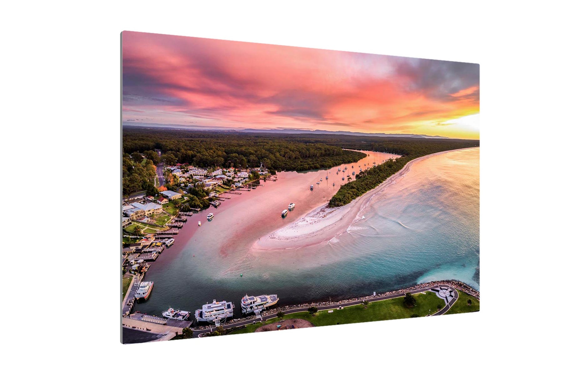 Photo print of an aerial view of a vivid sunrise over Currambene Creek and Myola in Huskisson, the entrance to Jervis Bay.