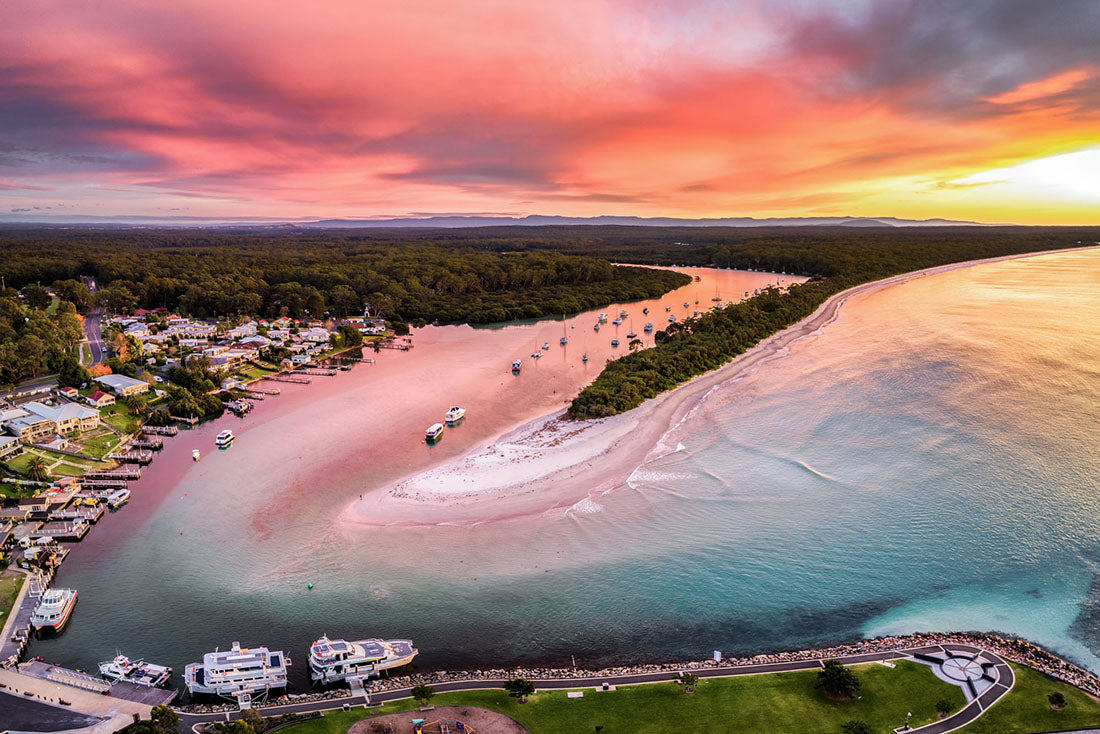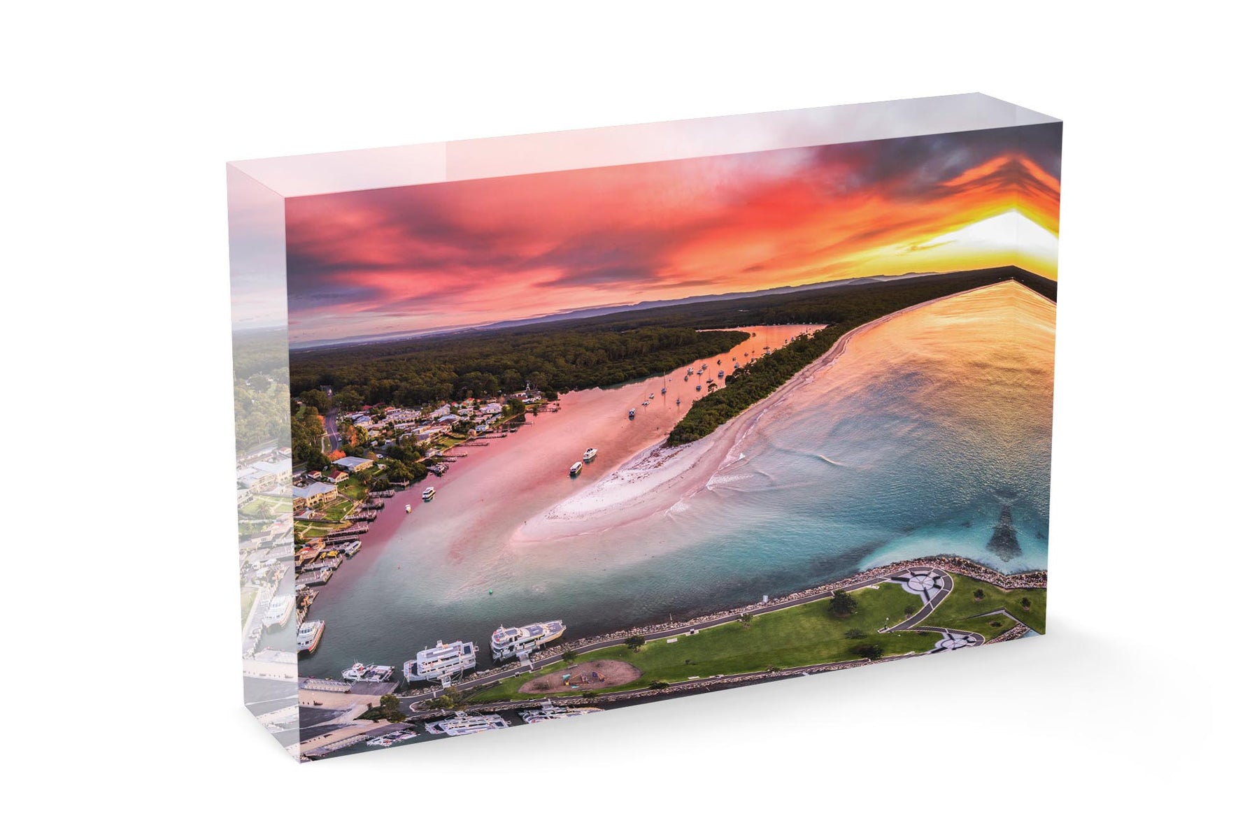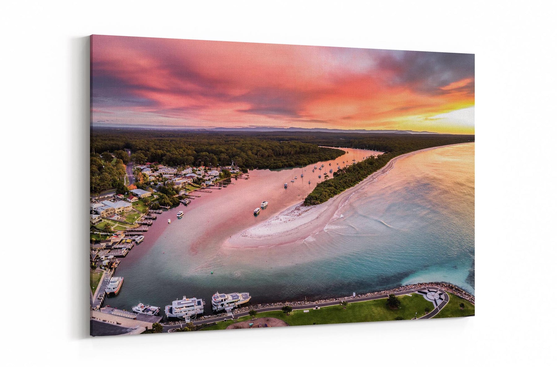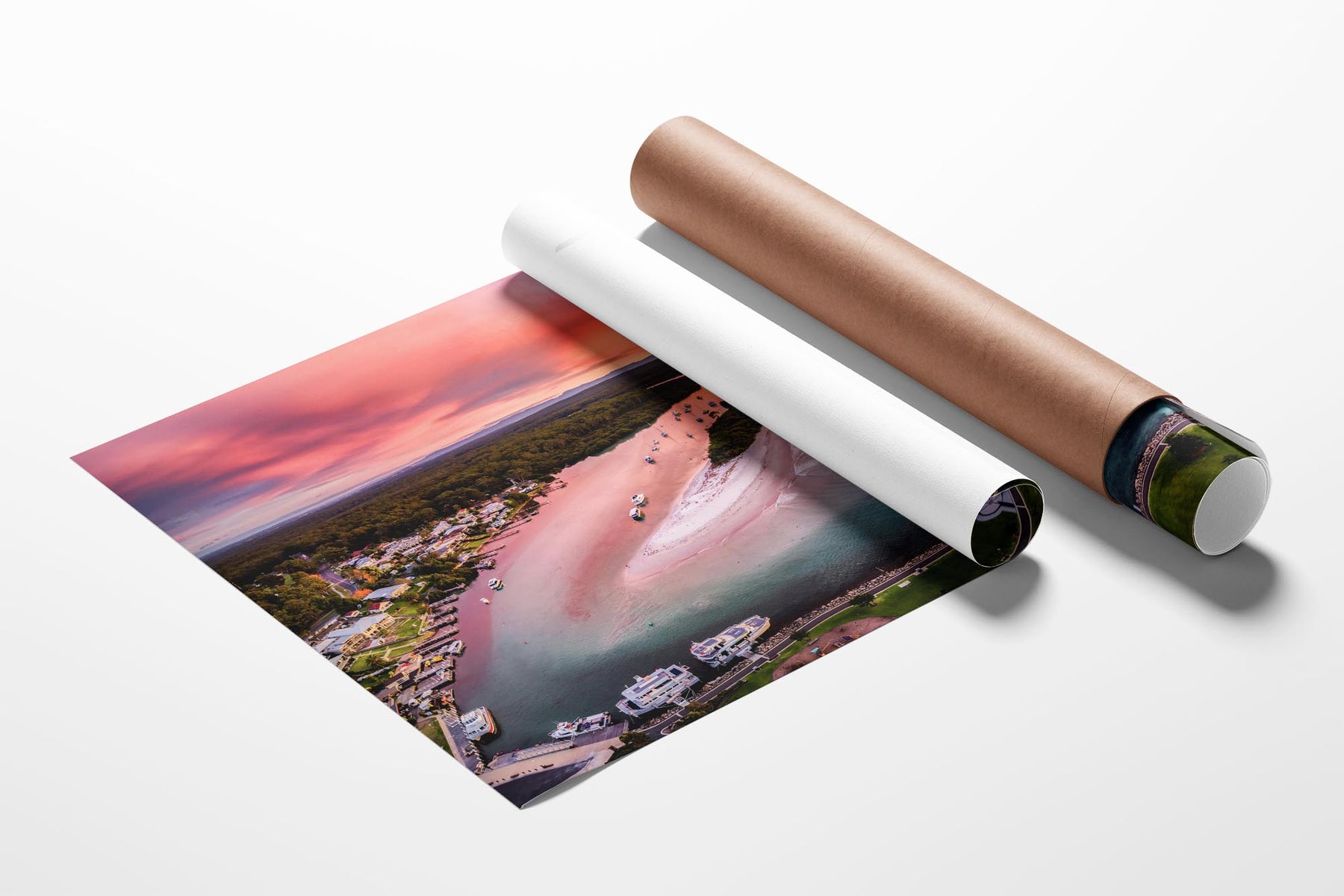 Photo print of an aerial view of a vivid sunrise over Currambene Creek and Myola in Huskisson, the entrance to Jervis Bay.