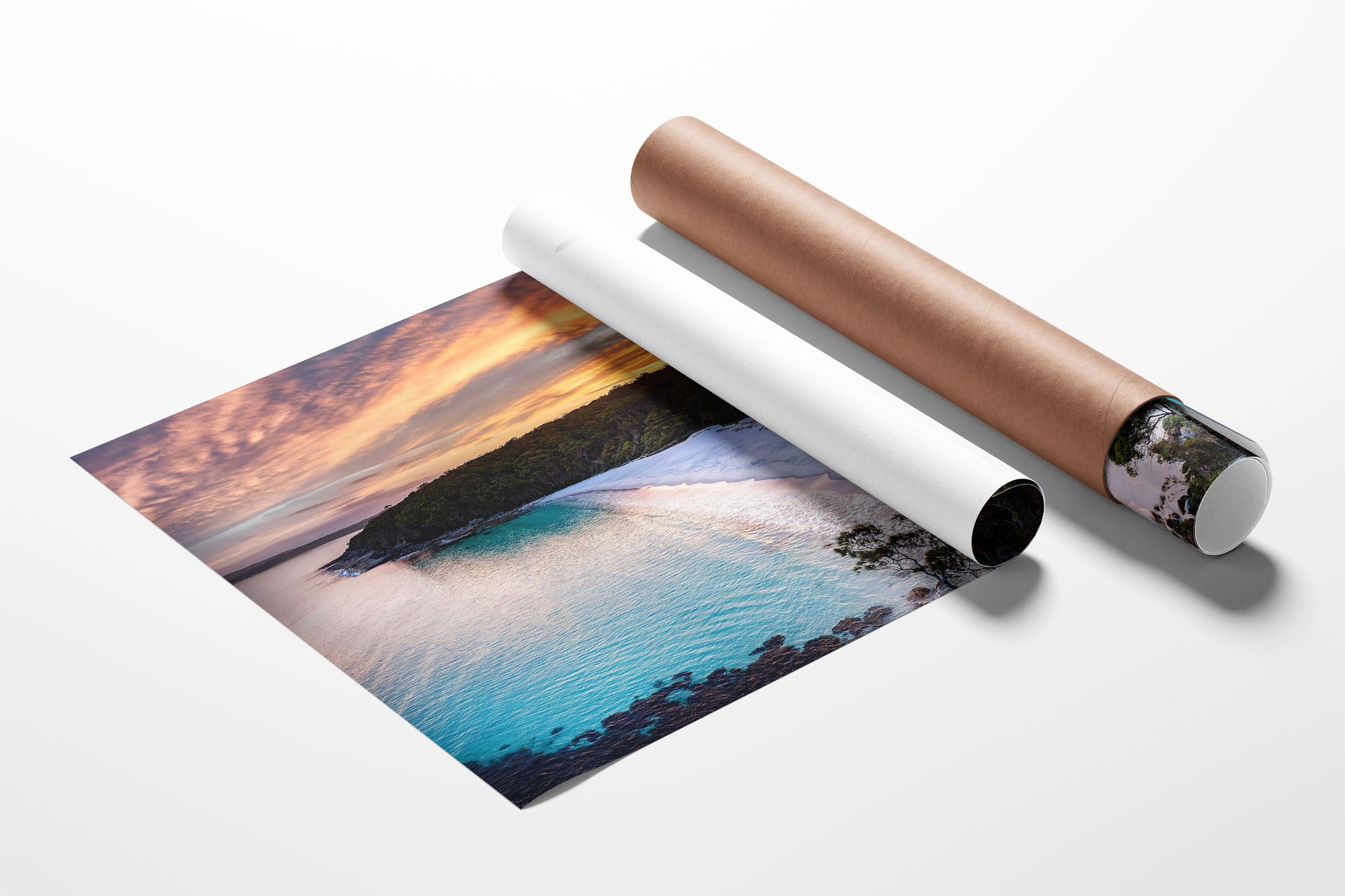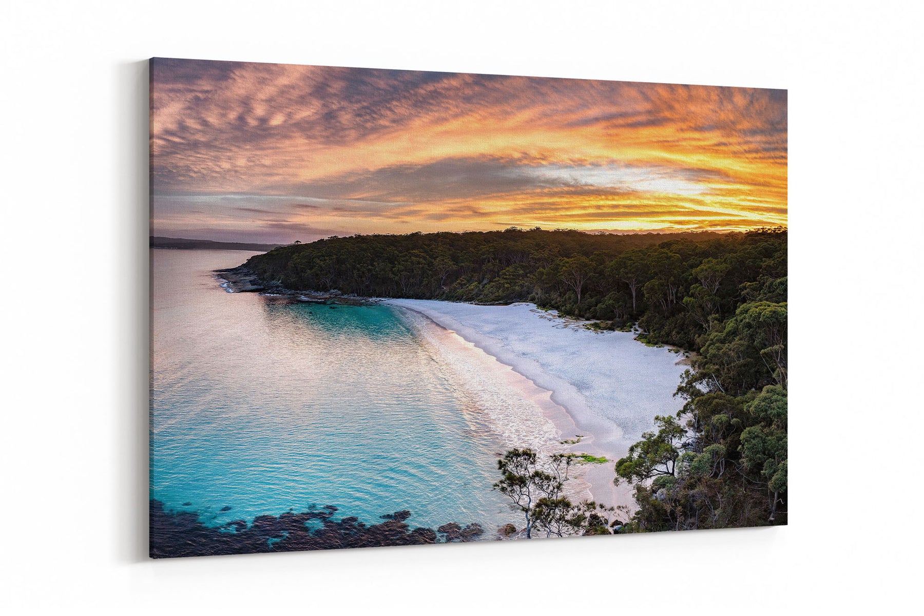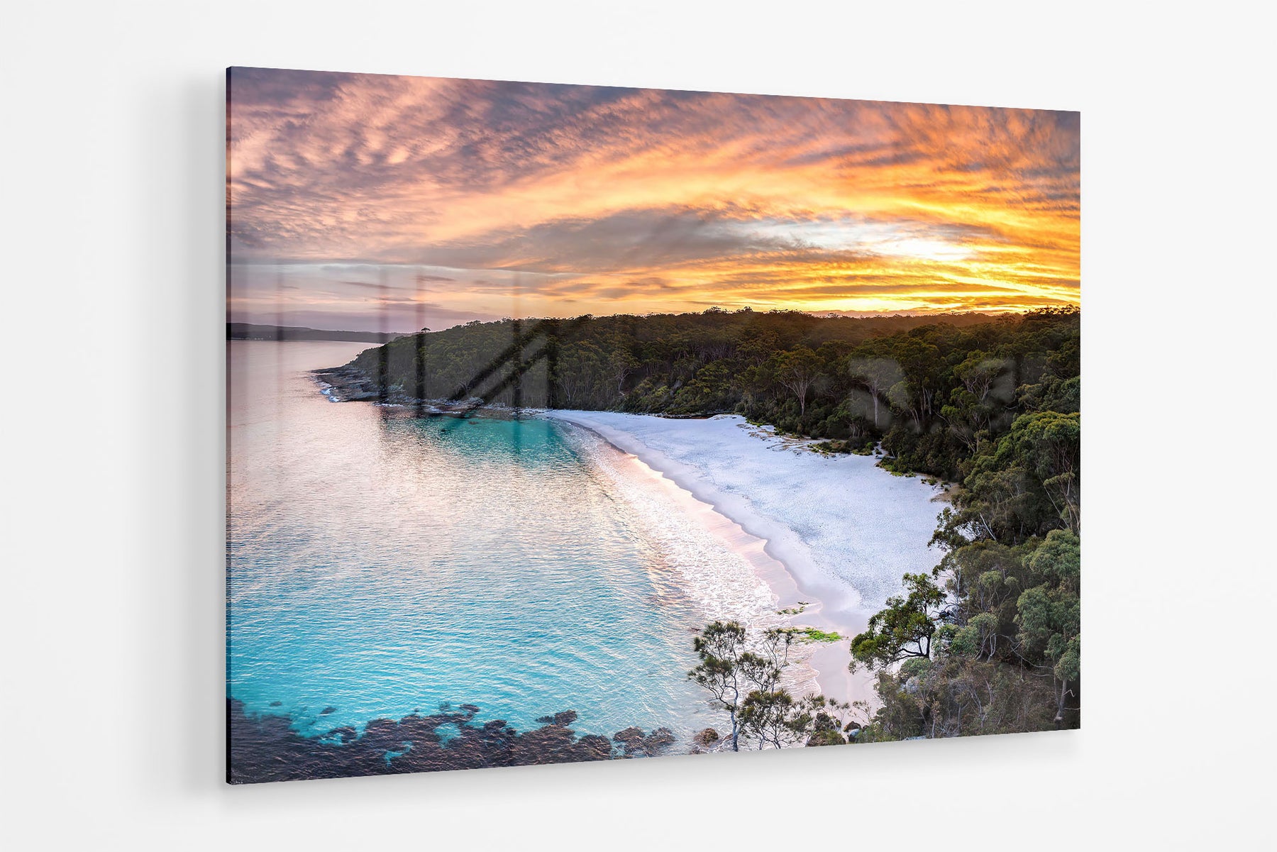 Immerse yourself in the breathtaking beauty of Jervis Bay with this exquisite sunset photo print, capturing Greenfield Beach's iconic shoreline bathed in vibrant golden hues. Expertly printed on museum-quality media, this artwork preserves every detail of the tranquil ocean waves and pastel sky, transforming your space into a coastal retreat.