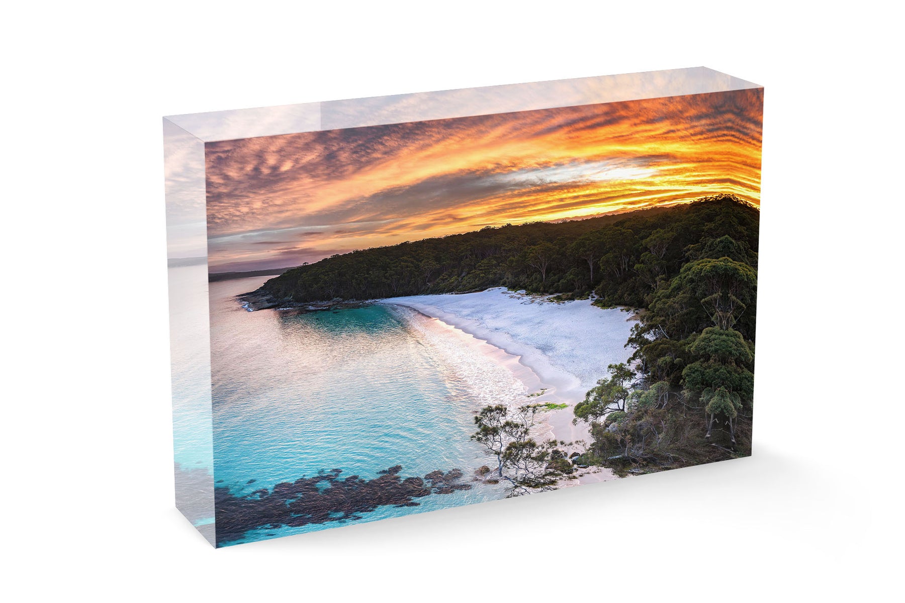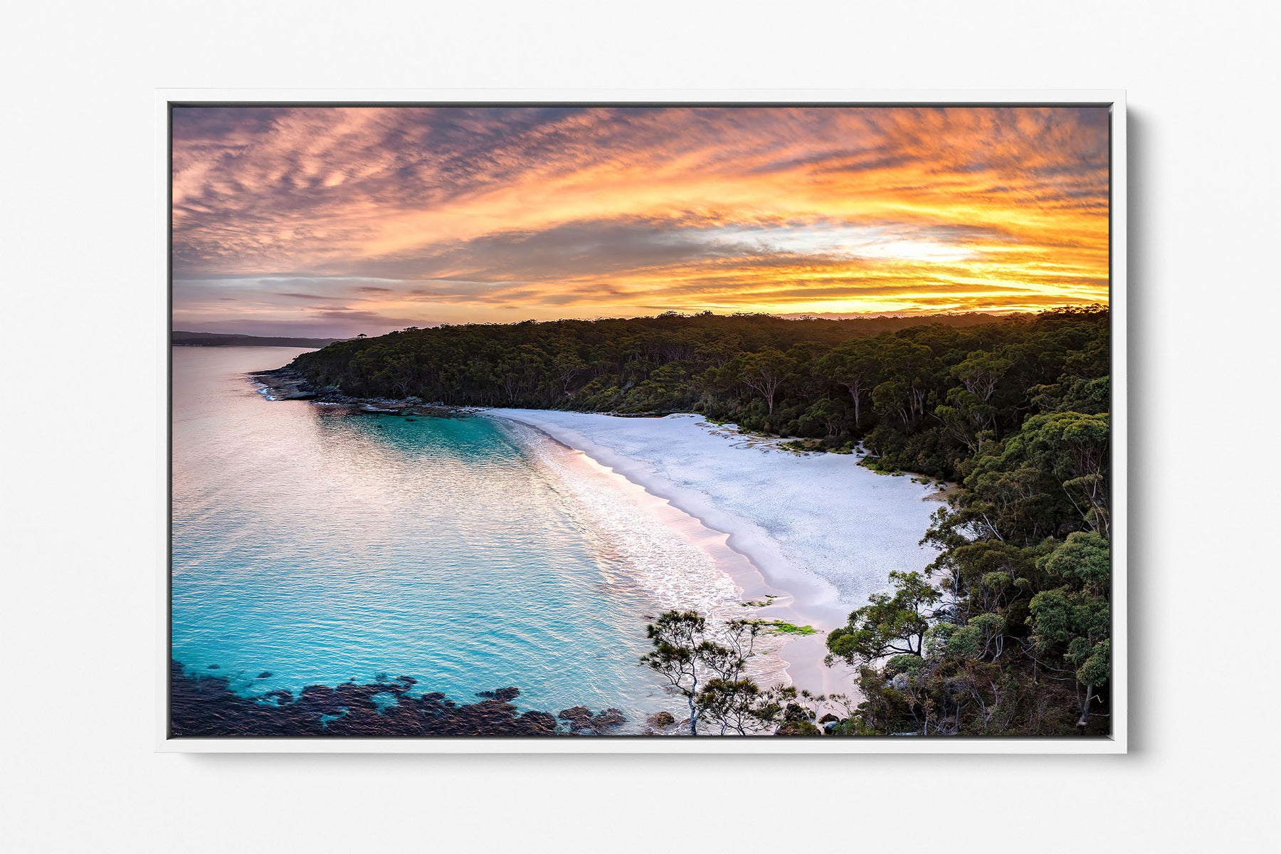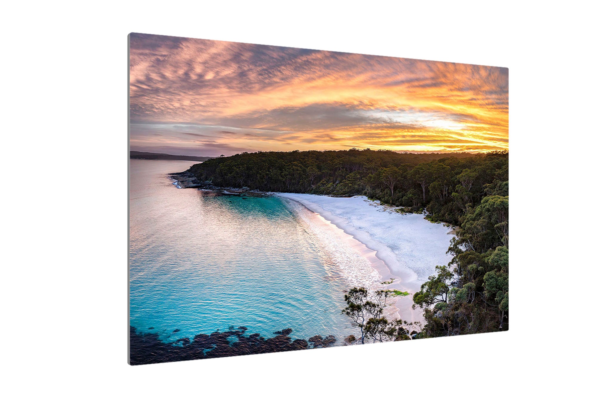Immerse yourself in the breathtaking beauty of Jervis Bay with this exquisite sunset photo print, capturing Greenfield Beach's iconic shoreline bathed in vibrant golden hues. Expertly printed on museum-quality media, this artwork preserves every detail of the tranquil ocean waves and pastel sky, transforming your space into a coastal retreat.