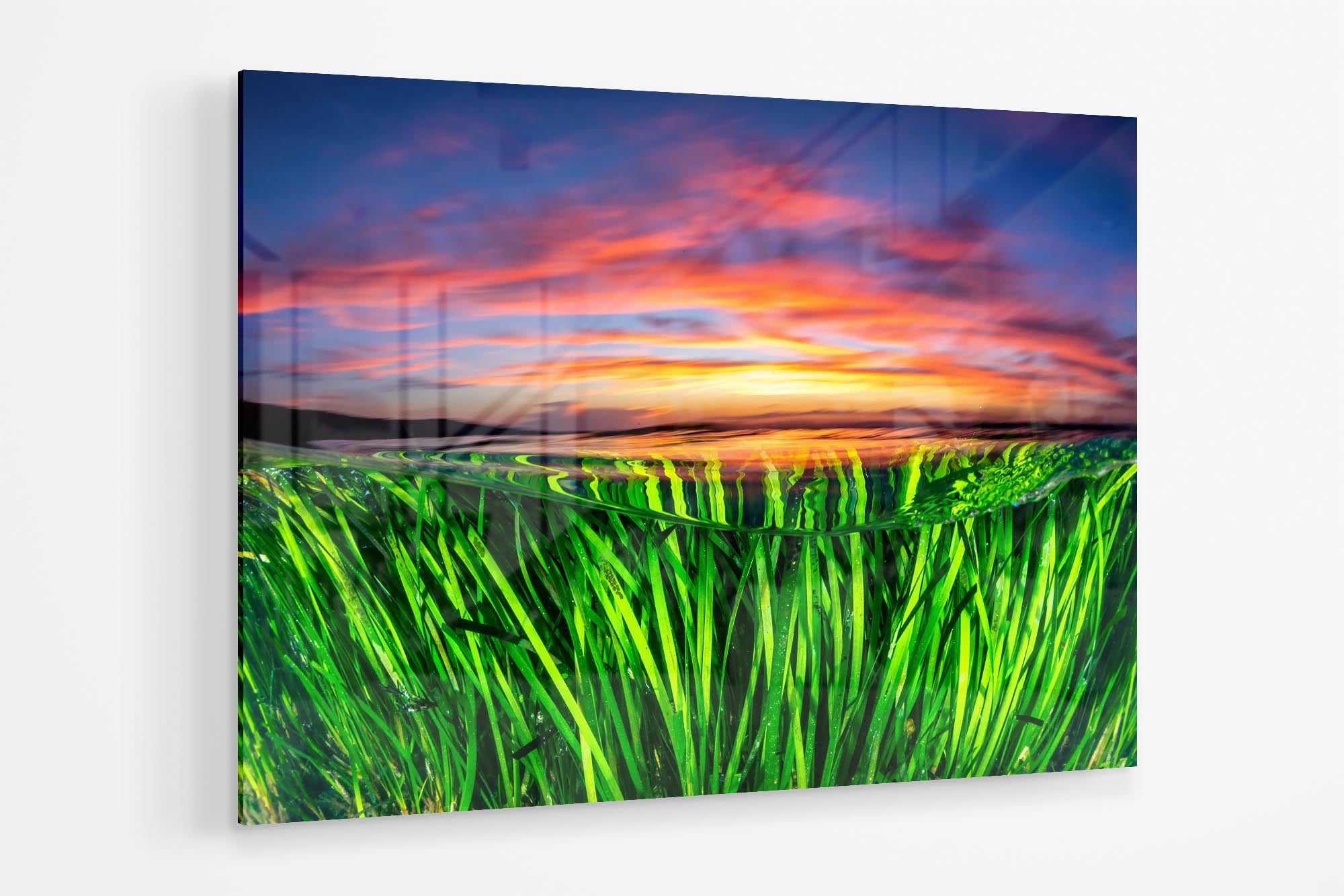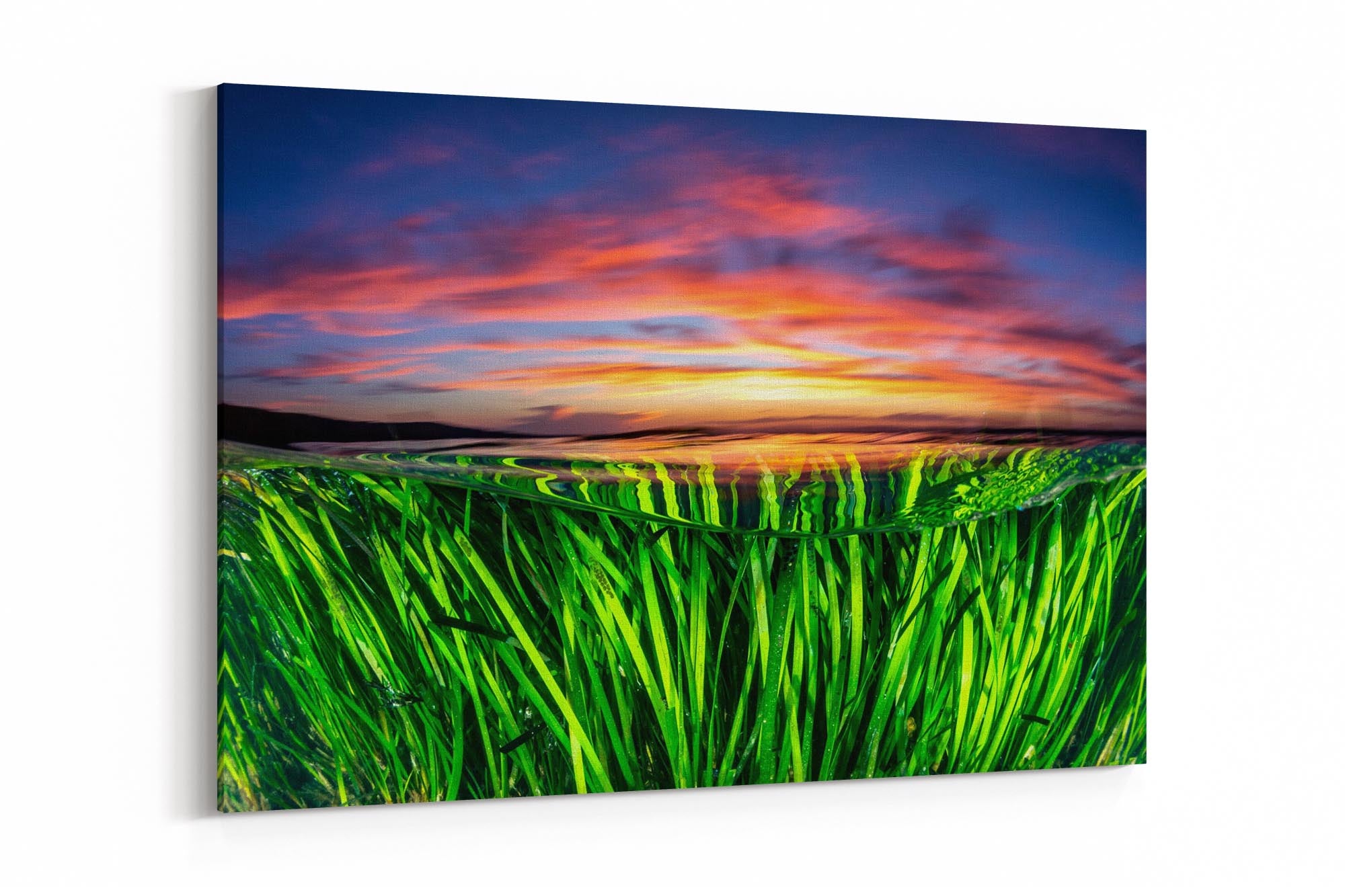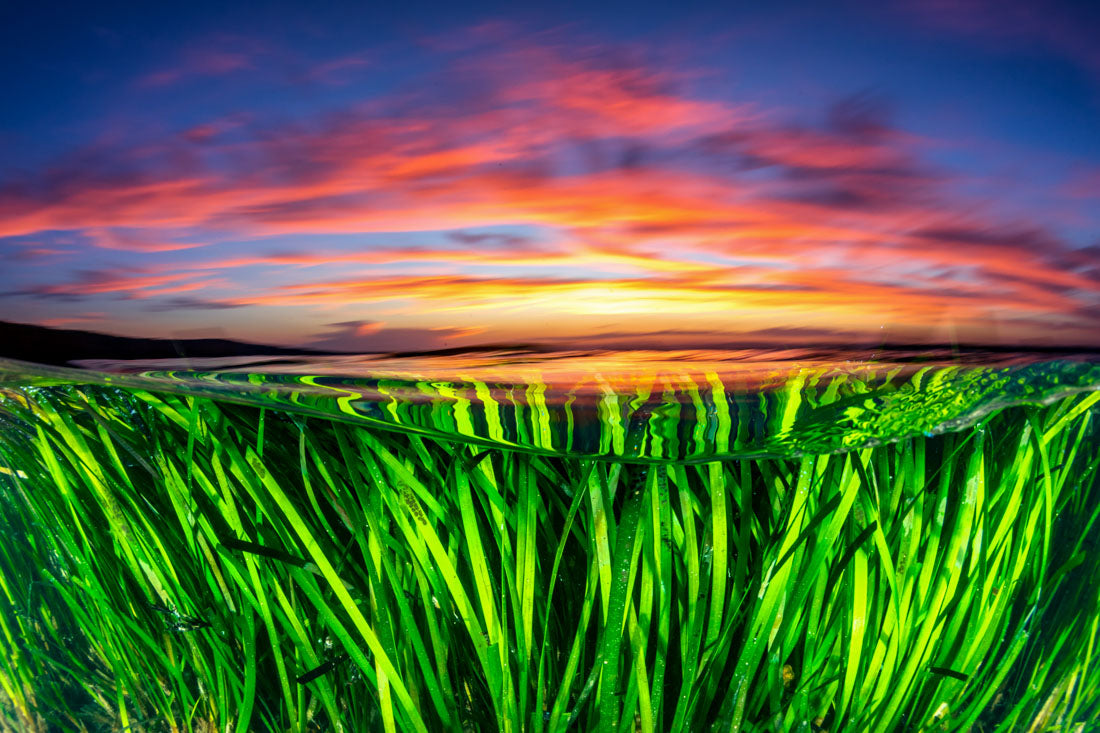 An over under image of a vivid sunset over the seagrass beds in Jervis Bay.