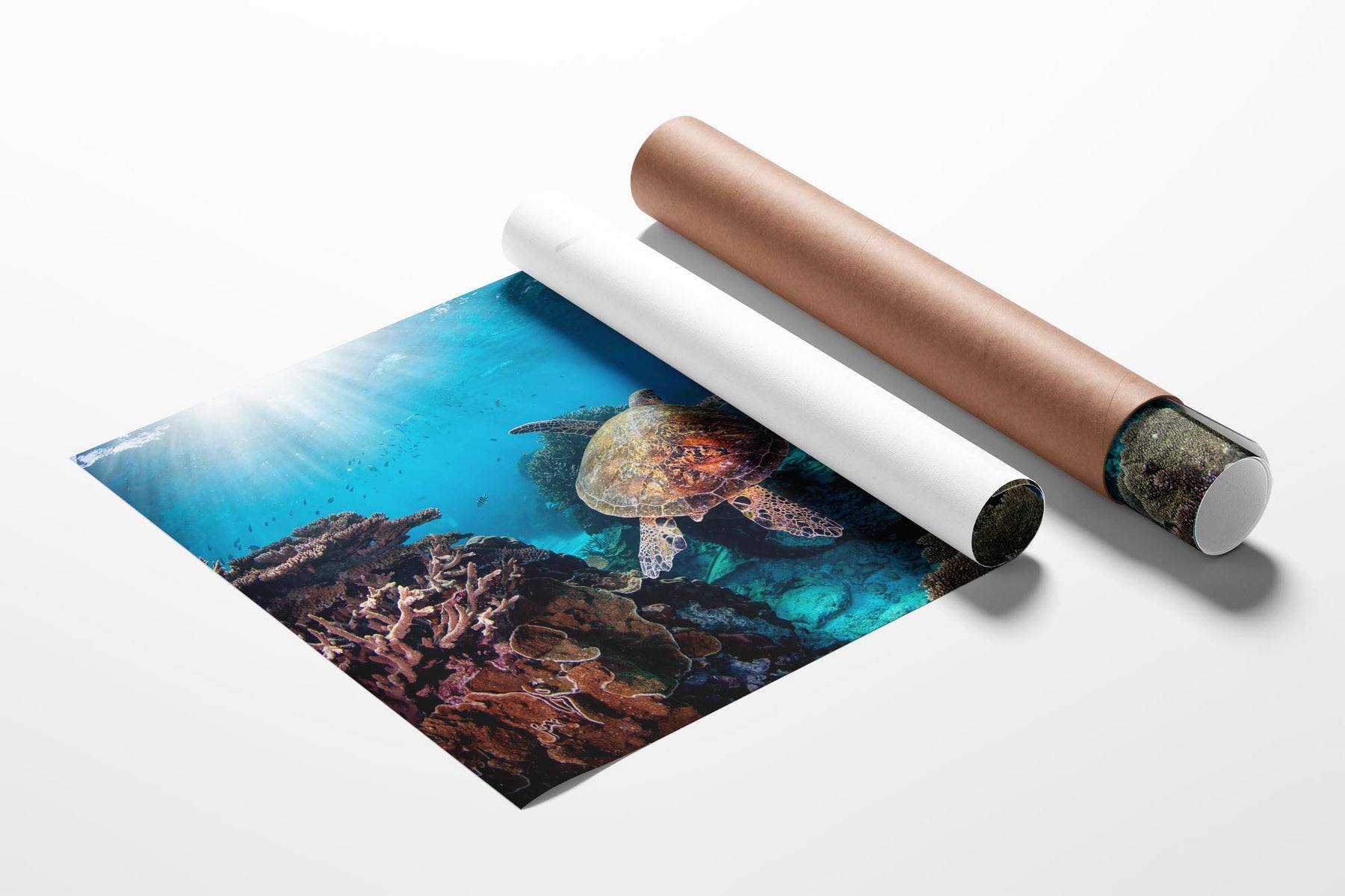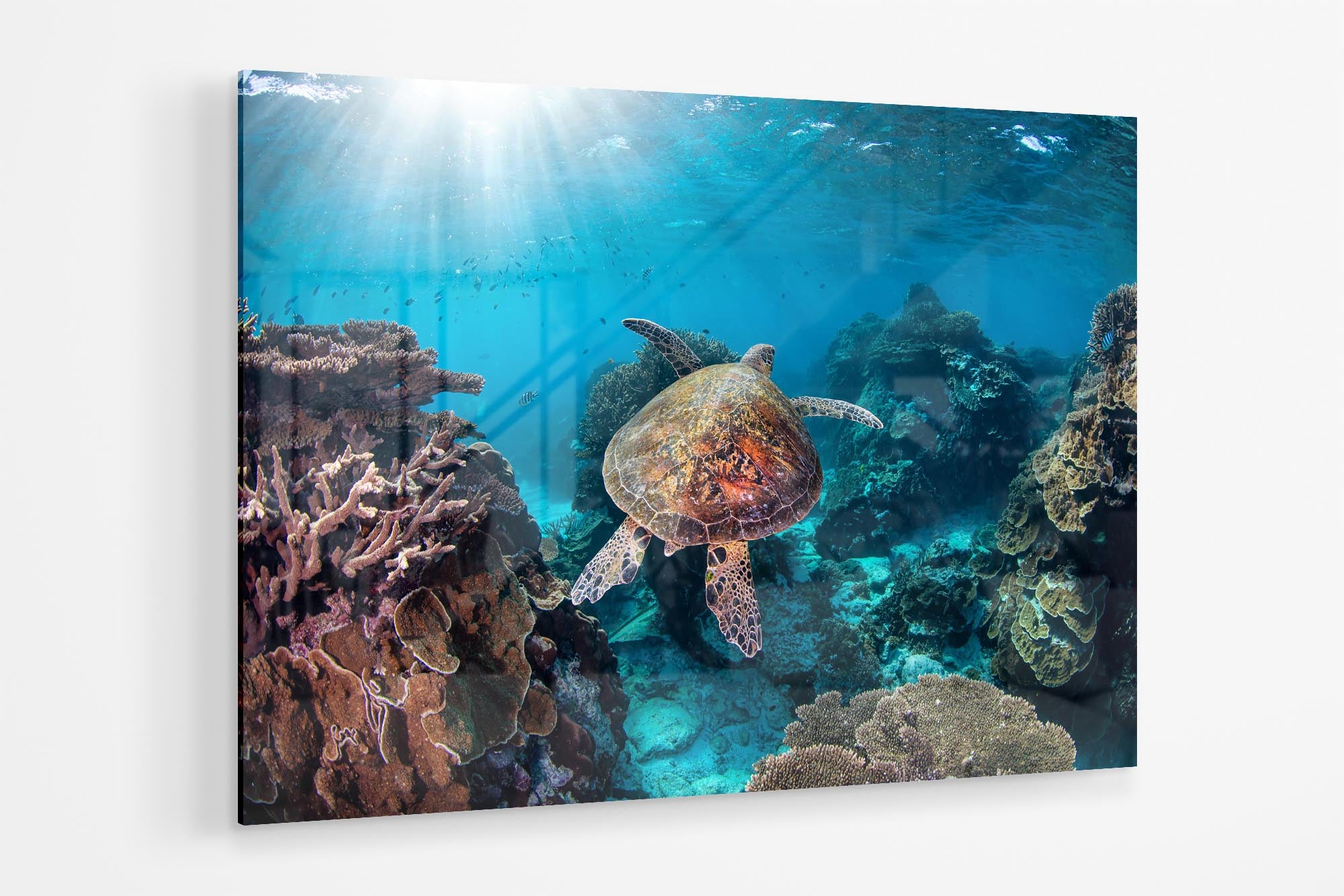 This breathtaking underwater photography print captures a Green Sea Turtle gliding gracefully through vibrant coral gardens on Lady Elliot Island, part of the UNESCO World Heritage-listed Great Barrier Reef. Shafts of afternoon light pierce the crystal-clear waters, illuminating the turtle’s elegant movement and the reef’s kaleidoscopic biodiversity.