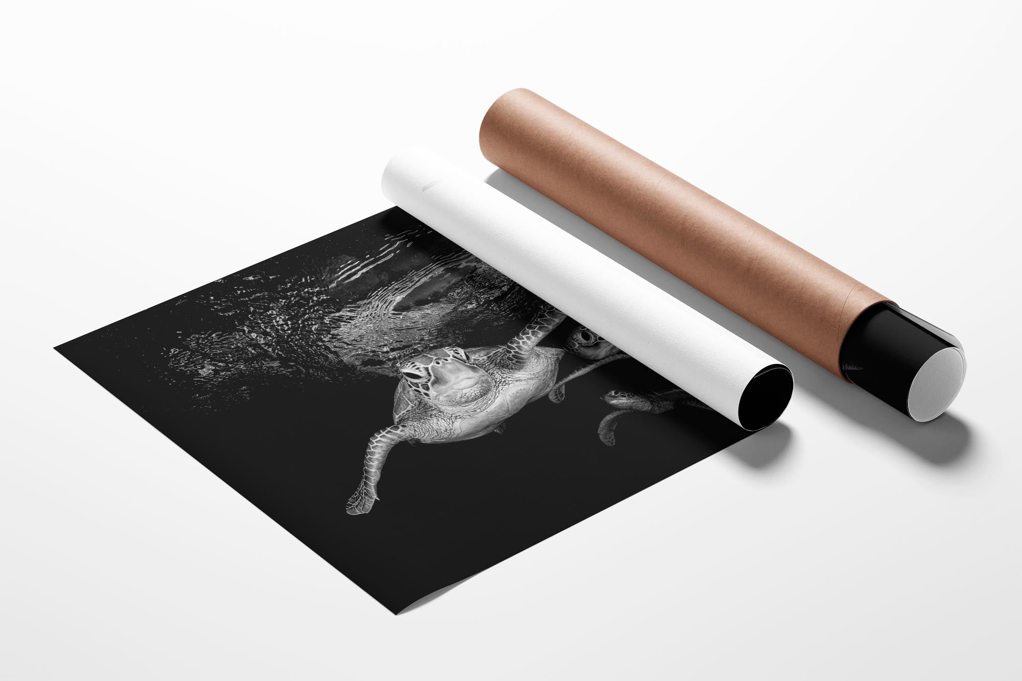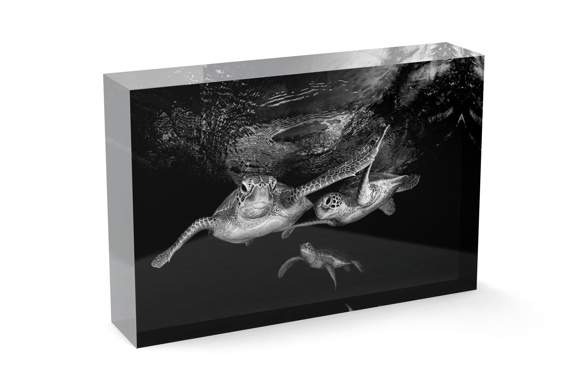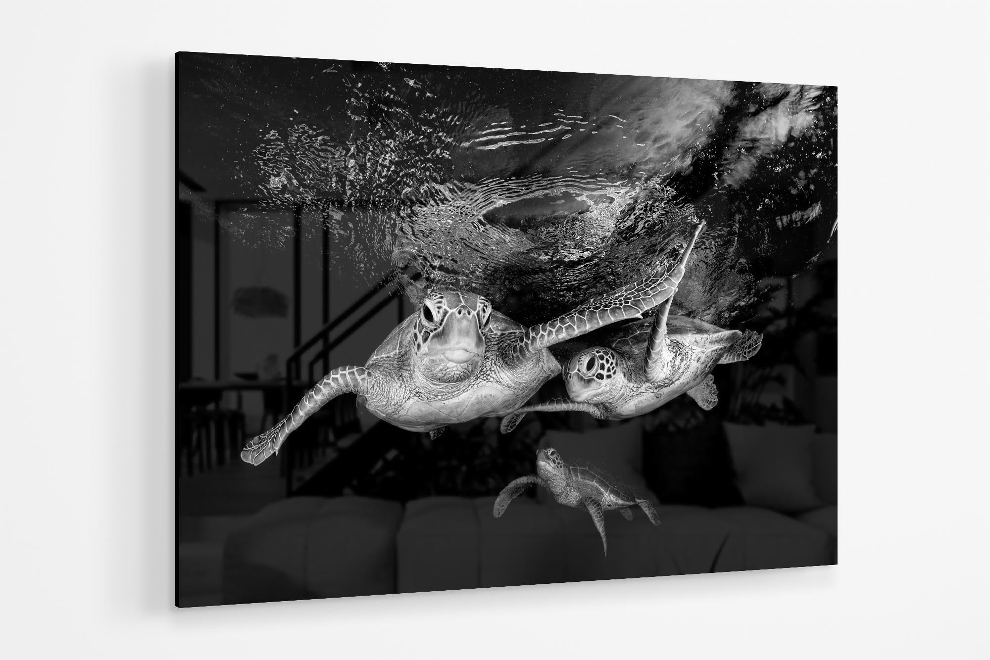 Witness the serene beauty of marine life in this exquisite black and white underwater photograph, capturing three Green Sea Turtles gliding gracefully over the reef in the mystical twilight hours. Shot in the pristine waters of Lady Elliot Island on Queensland's Southern Great Barrier Reef, this artwork transforms a magical underwater moment into a timeless celebration of movement, form and negative space.