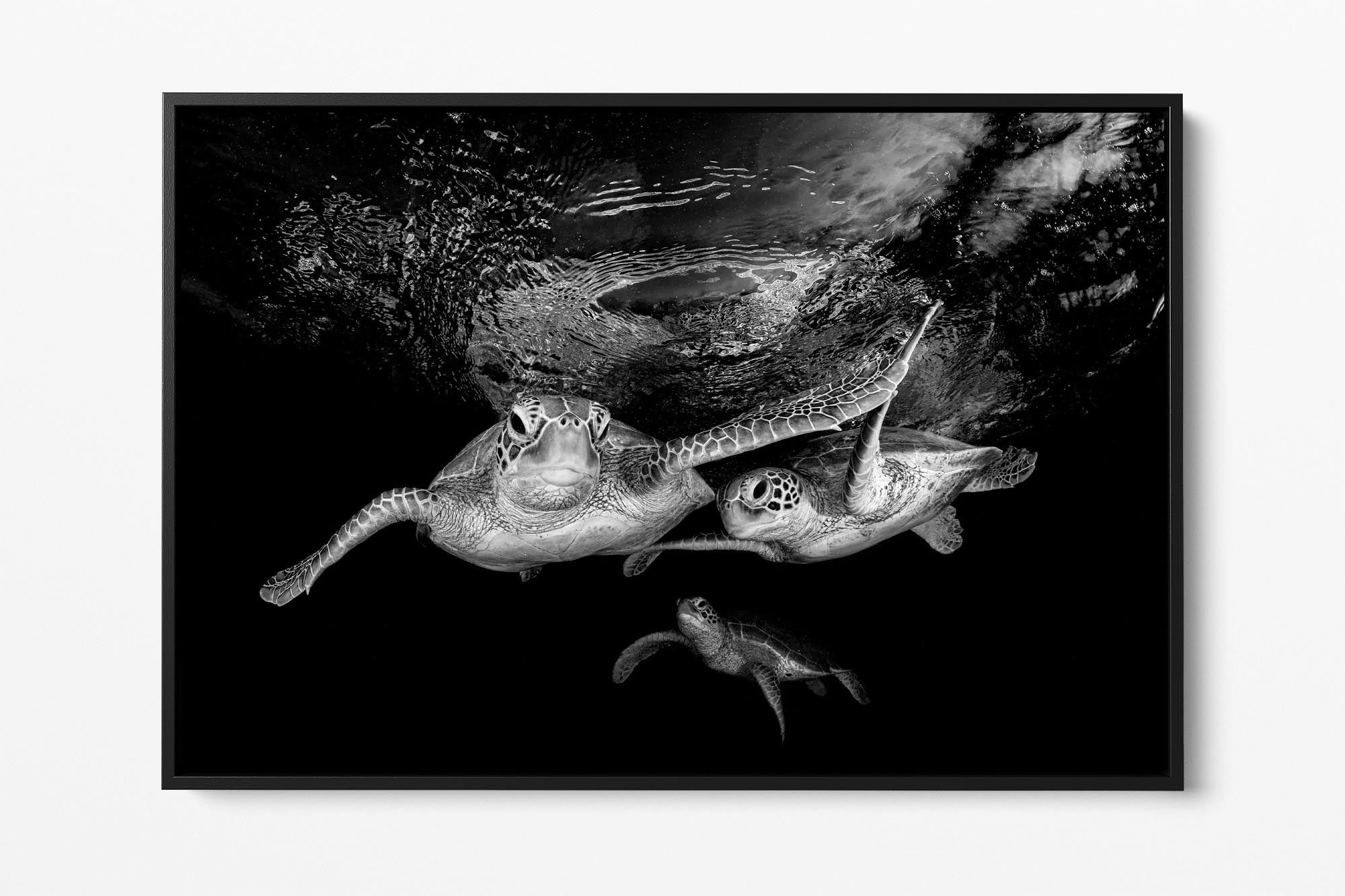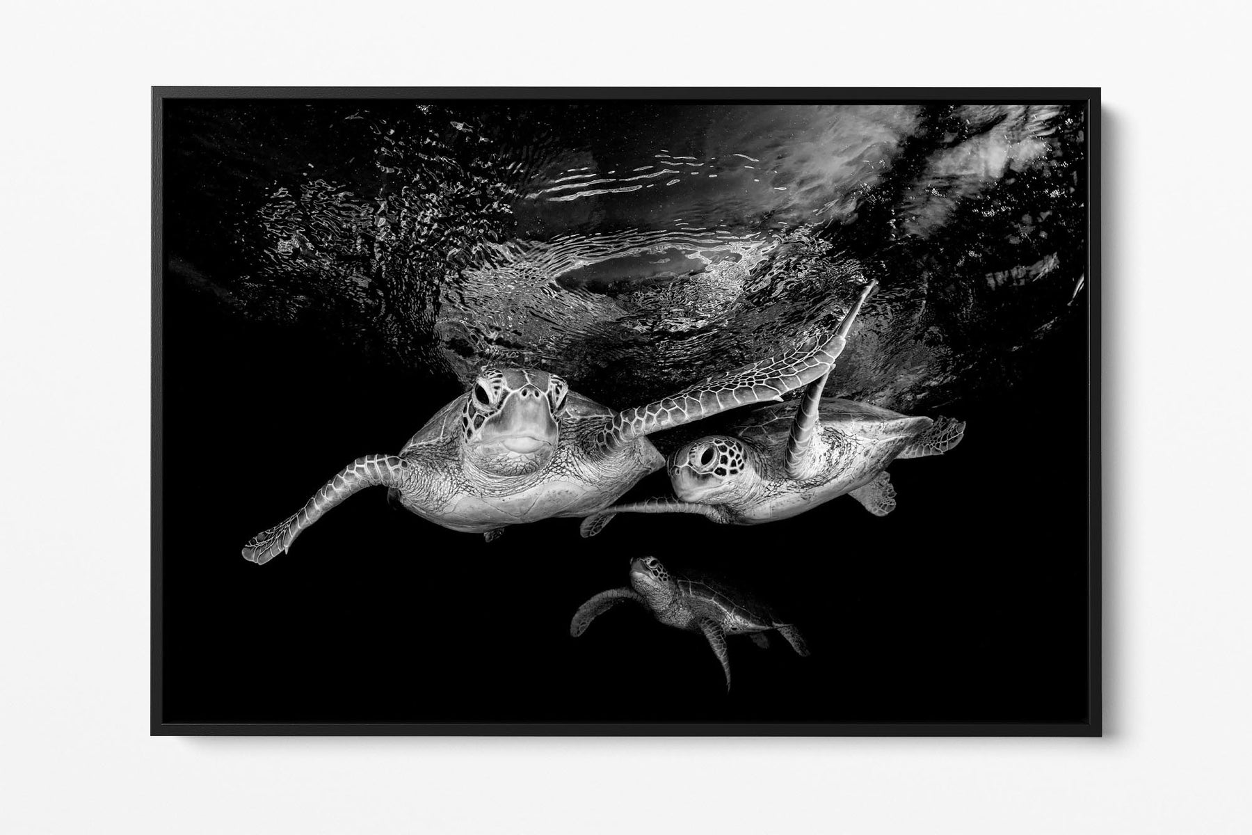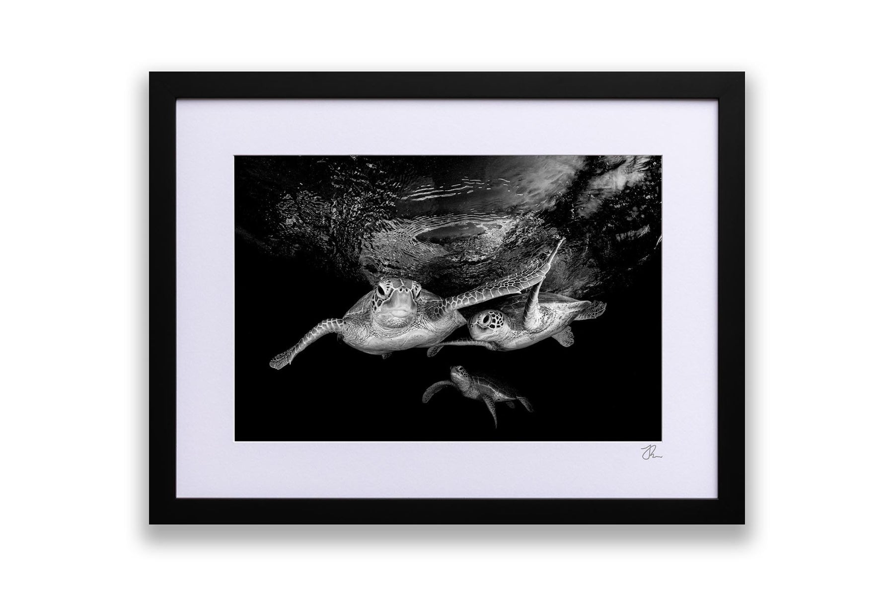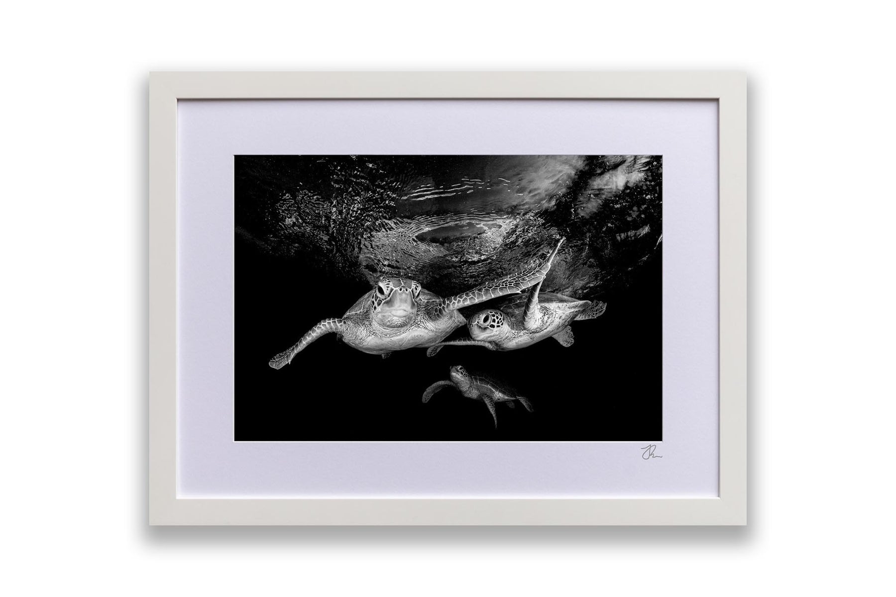 Trio at Twilight Fine Art Print – Green Sea Turtles at Lady Elliot Island | Monochrome Great Barrier Reef Photography