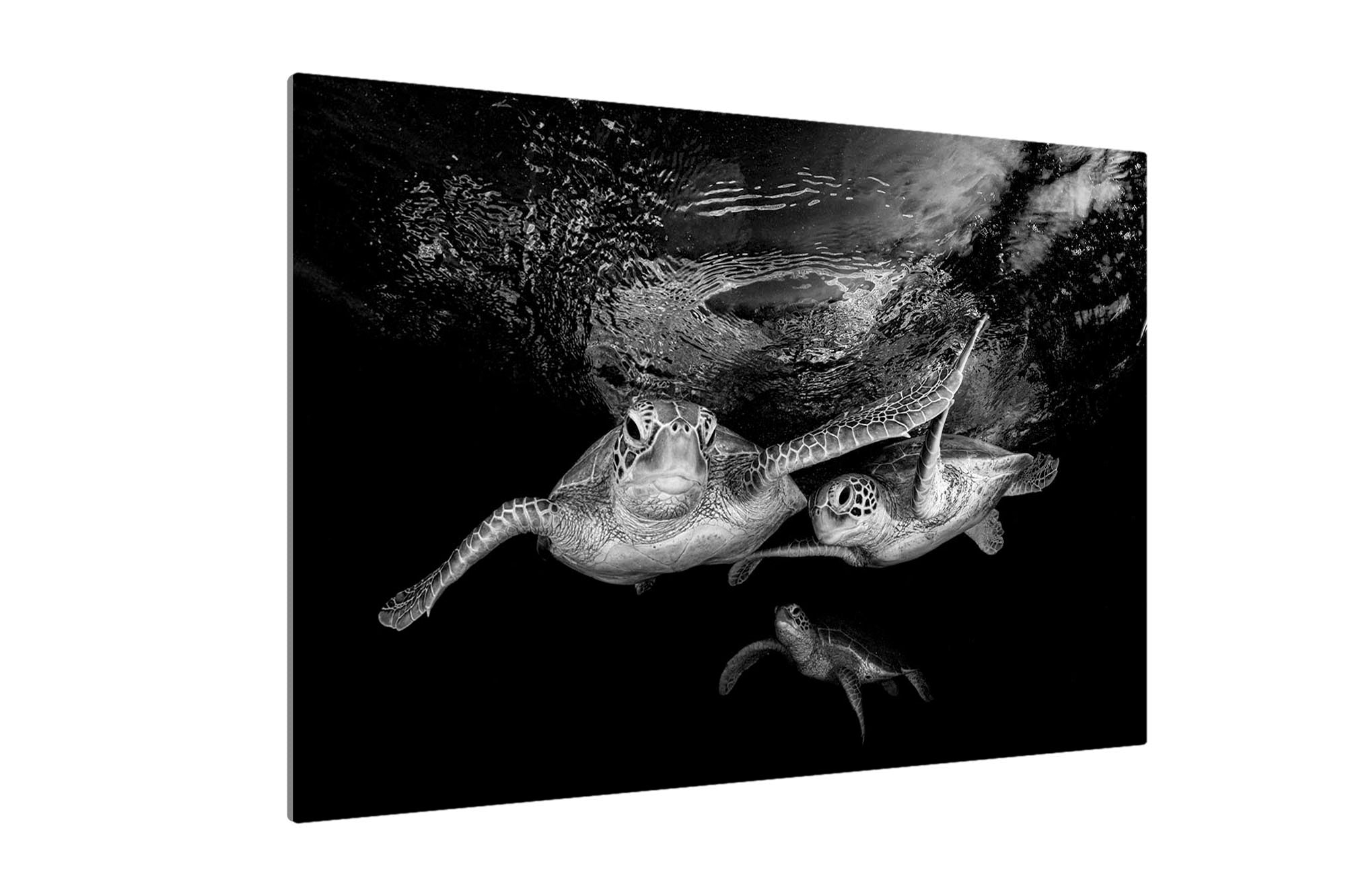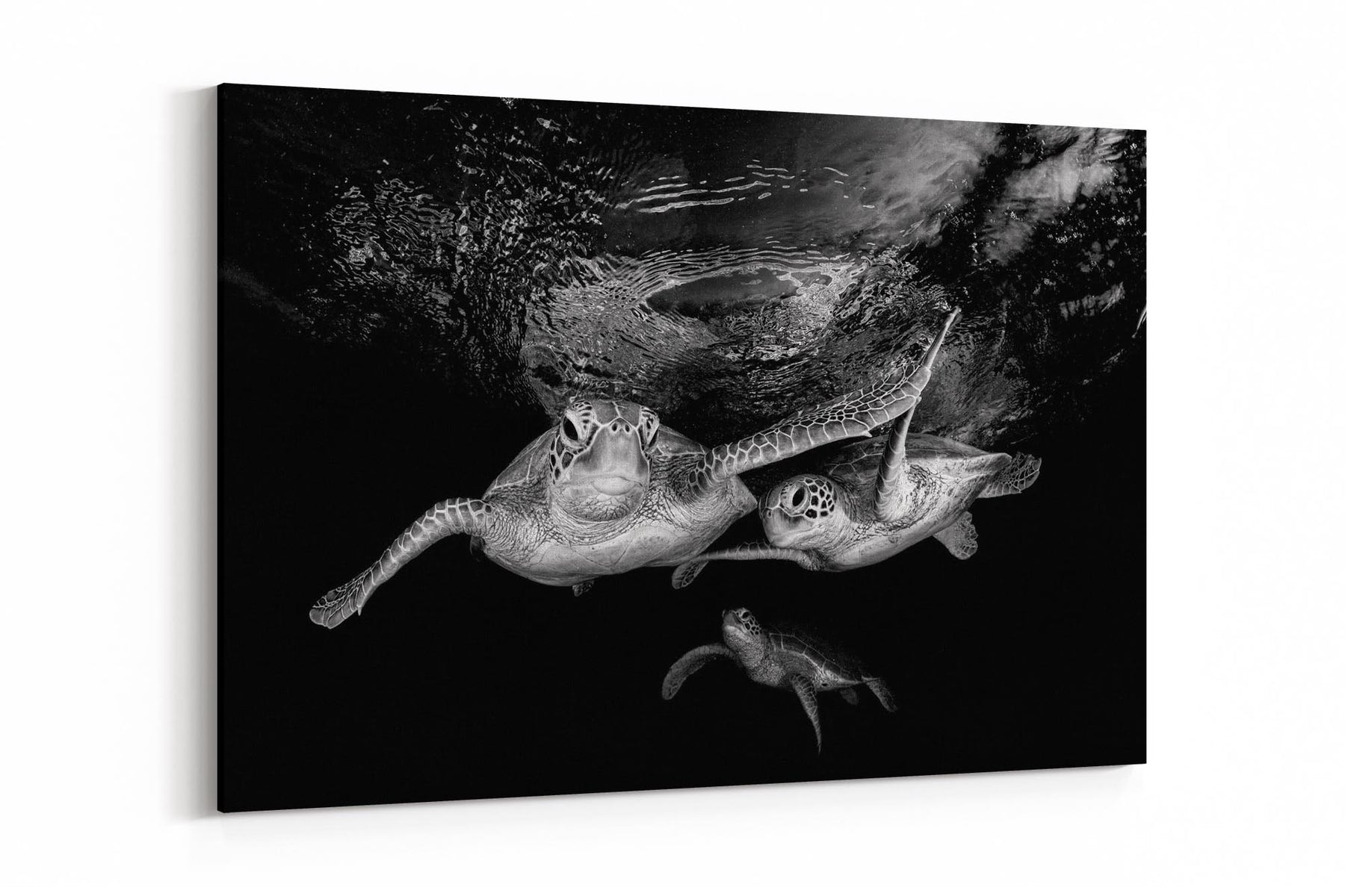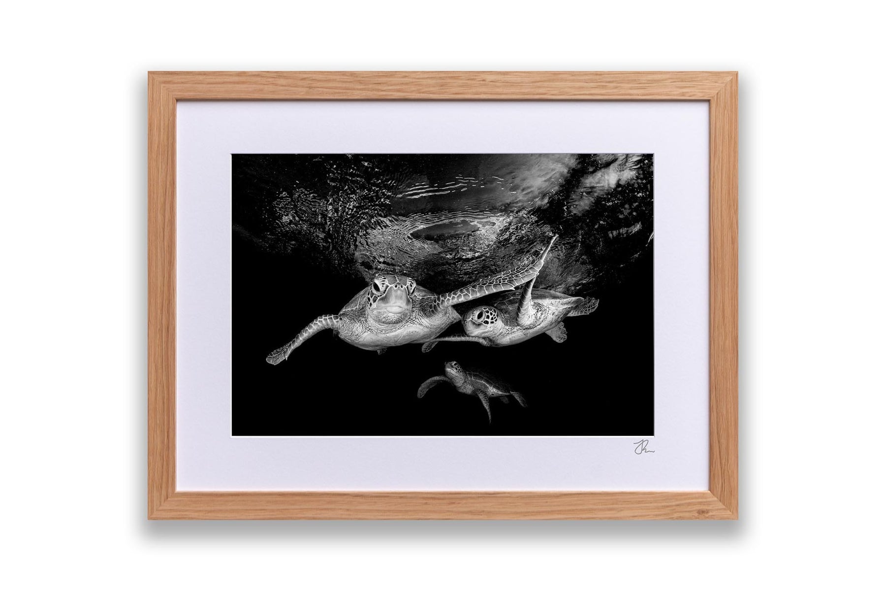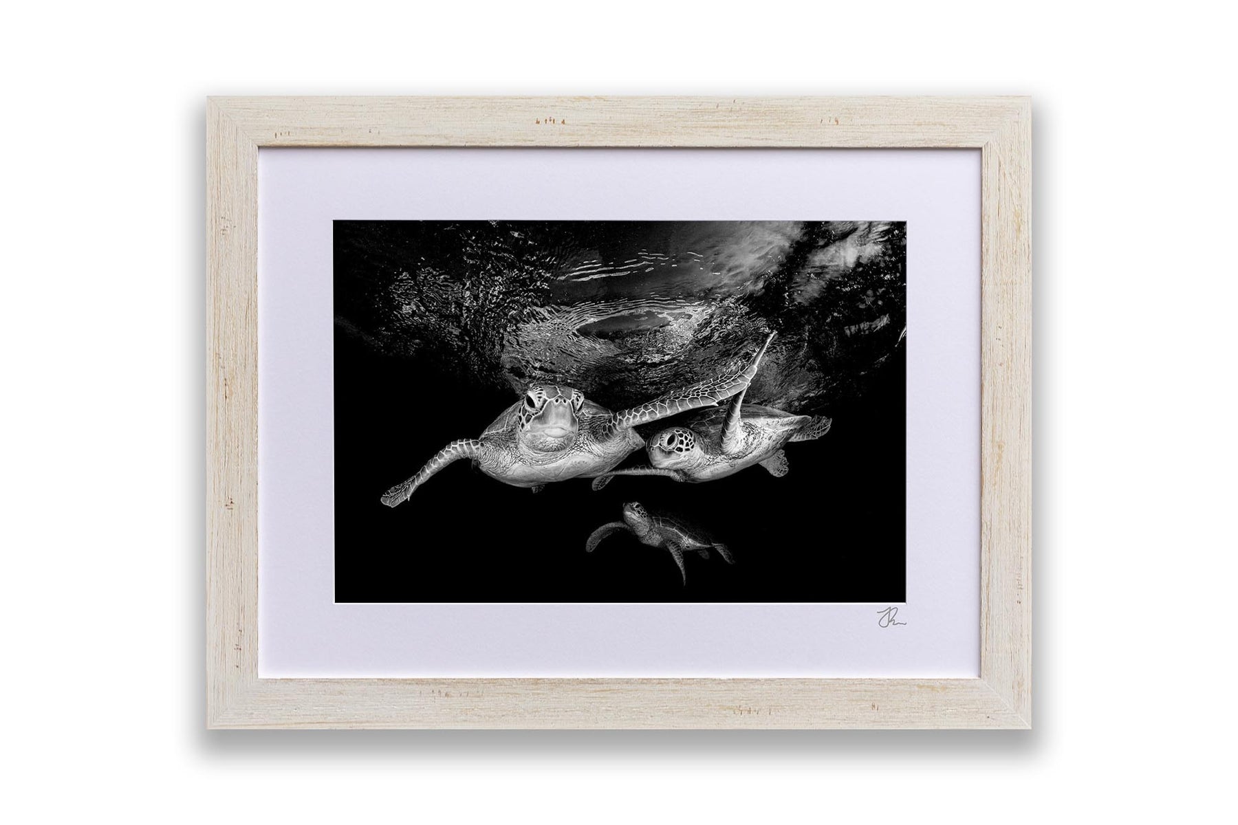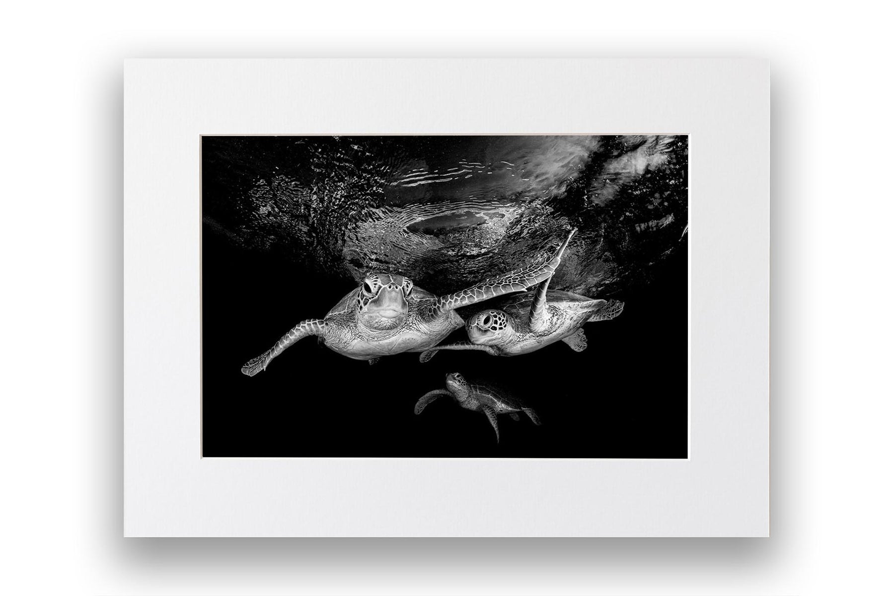 Trio at Twilight Fine Art Print – Green Sea Turtles at Lady Elliot Island | Monochrome Great Barrier Reef Photography