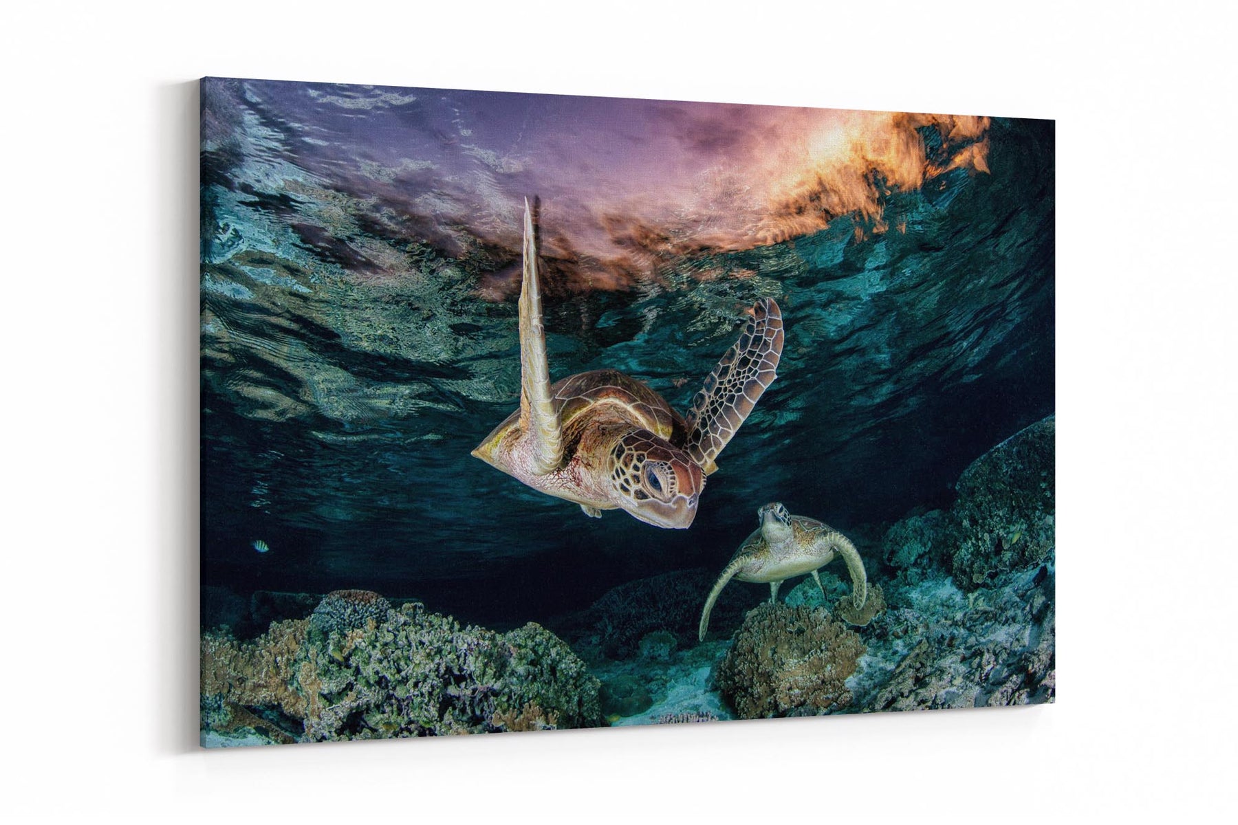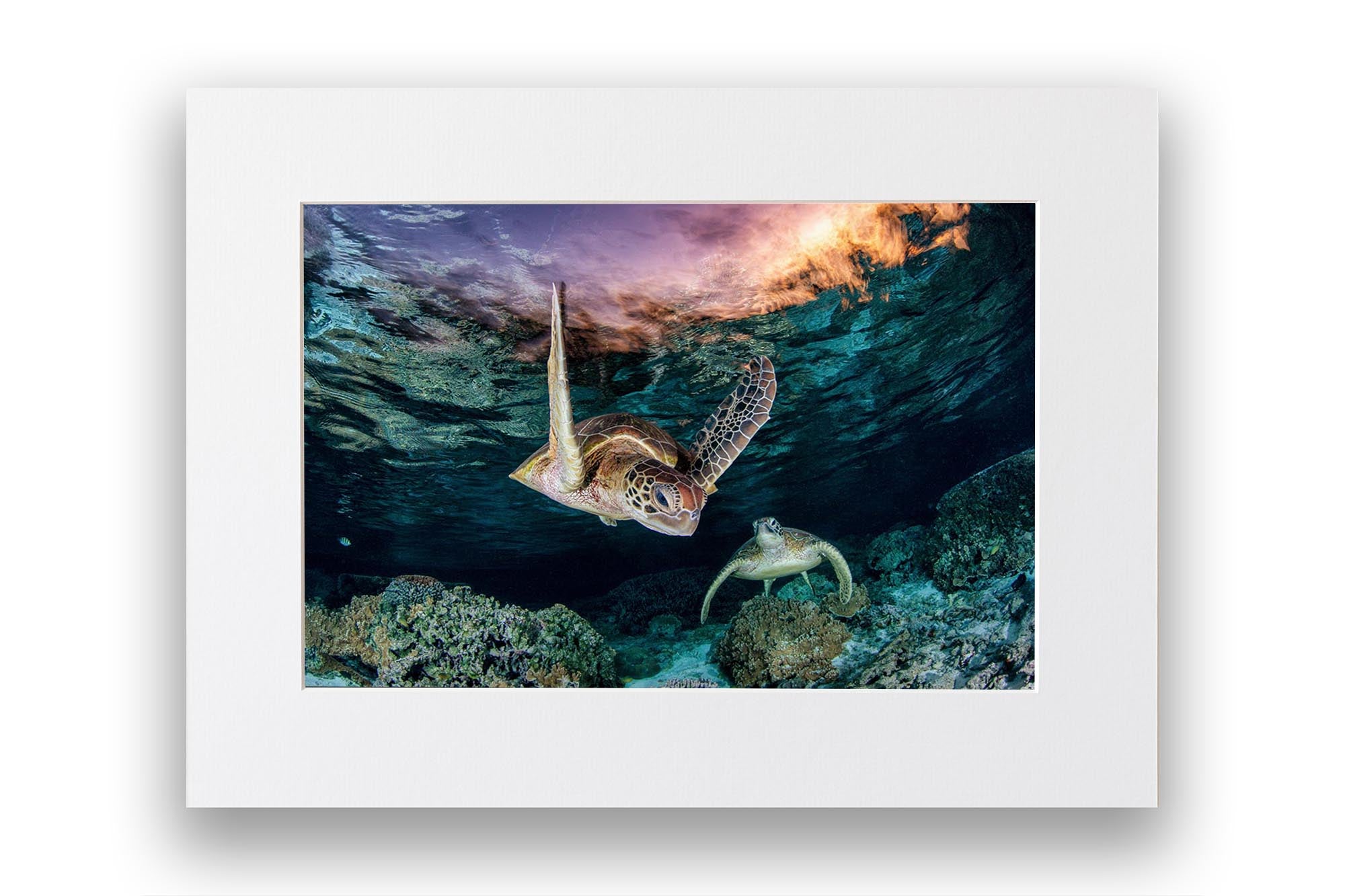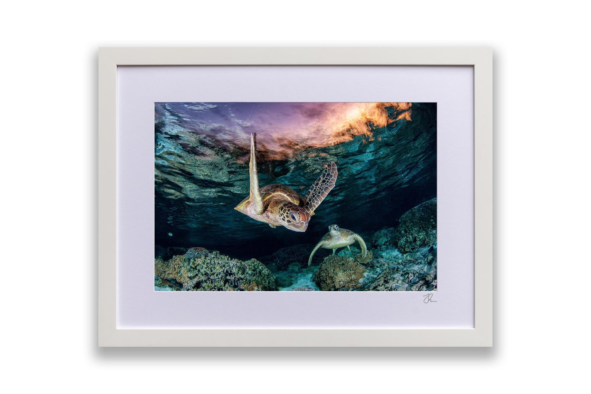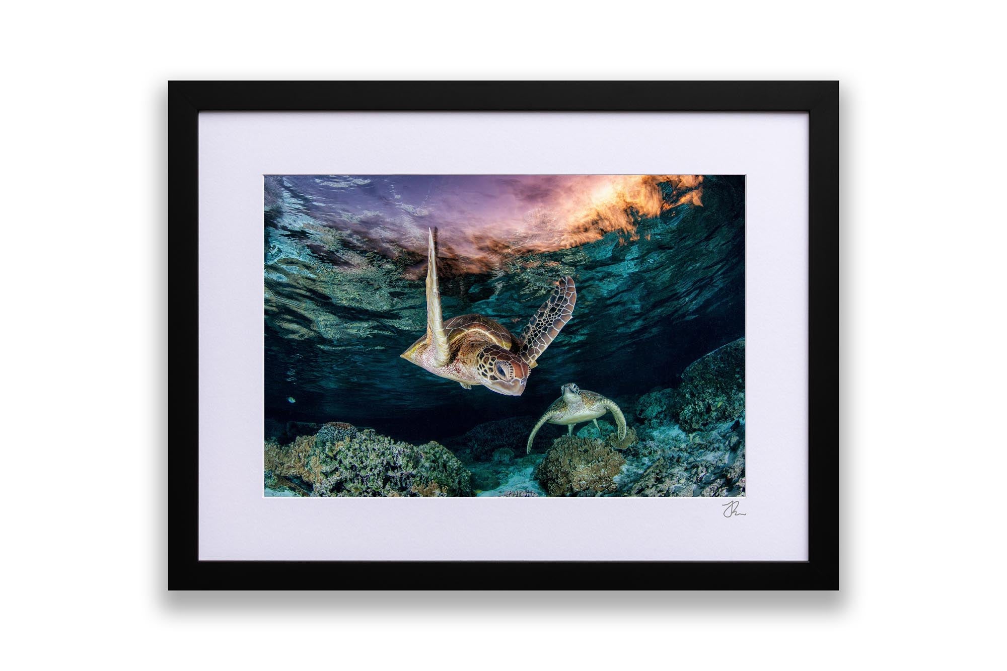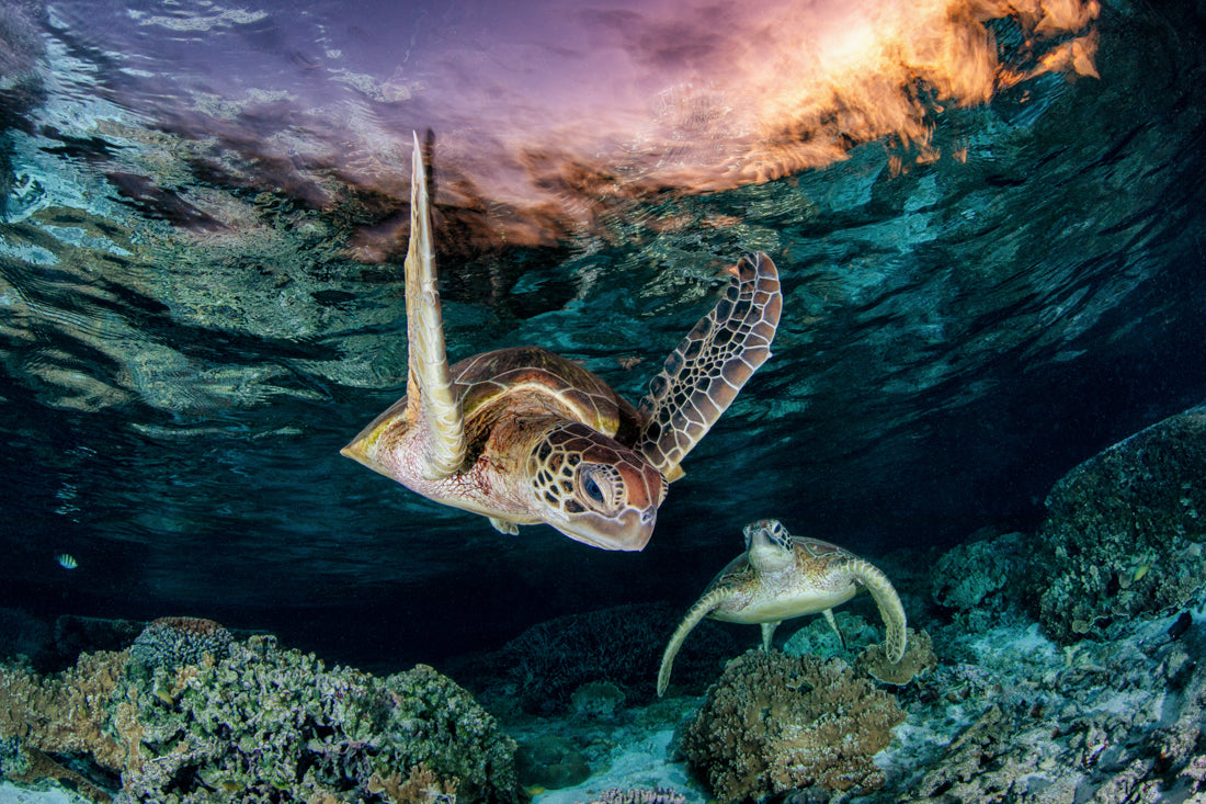 This ethereal underwater photography print captures two endangered Green Sea Turtles (Chelonia mydas) gliding over vibrant coral gardens in the twilight hues of Lady Elliot Island’s lagoon, the southernmost gem of Queensland’s UNESCO World Heritage-listed Great Barrier Reef. Bathed in the soft, orange-pink light of post sunset, the turtles’  movements and intricate shell patterns contrast against the reef’s dusky blues, creating a scene of serene harmony in one of Earth’s most fragile and biodiverse ecosystems.