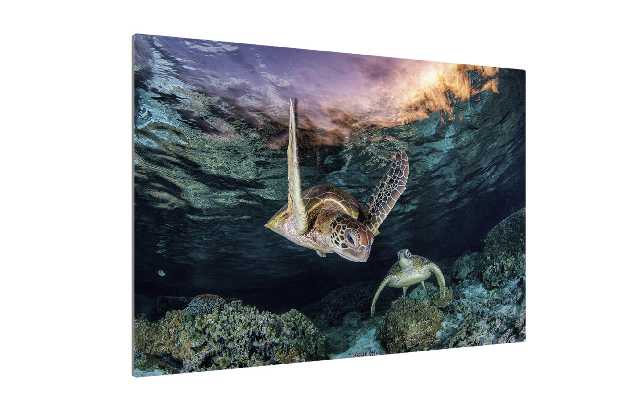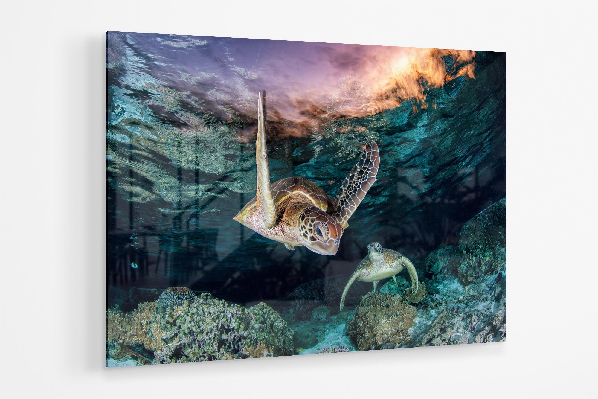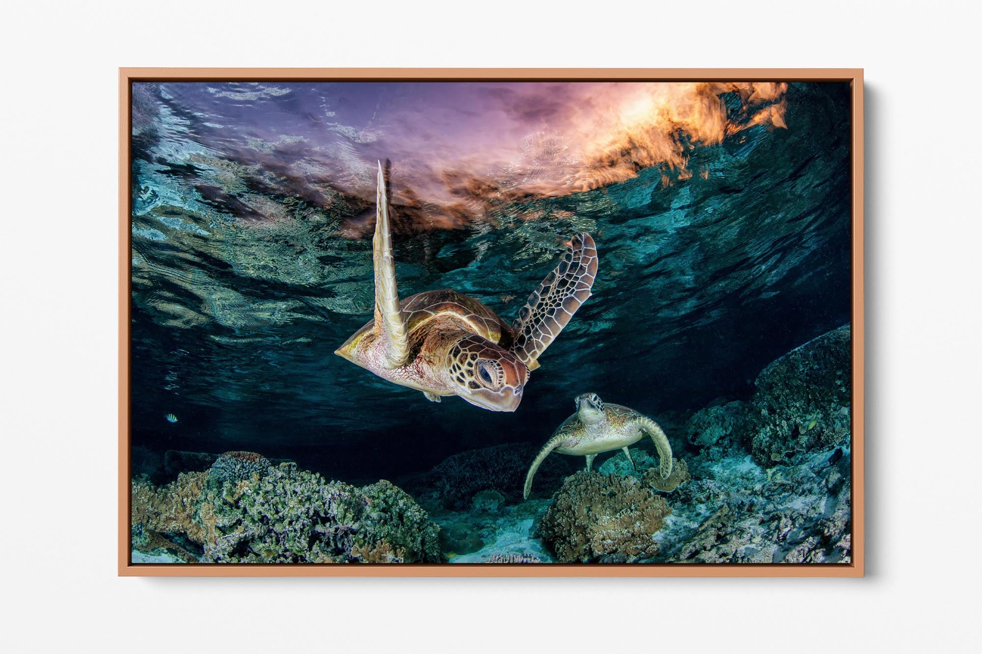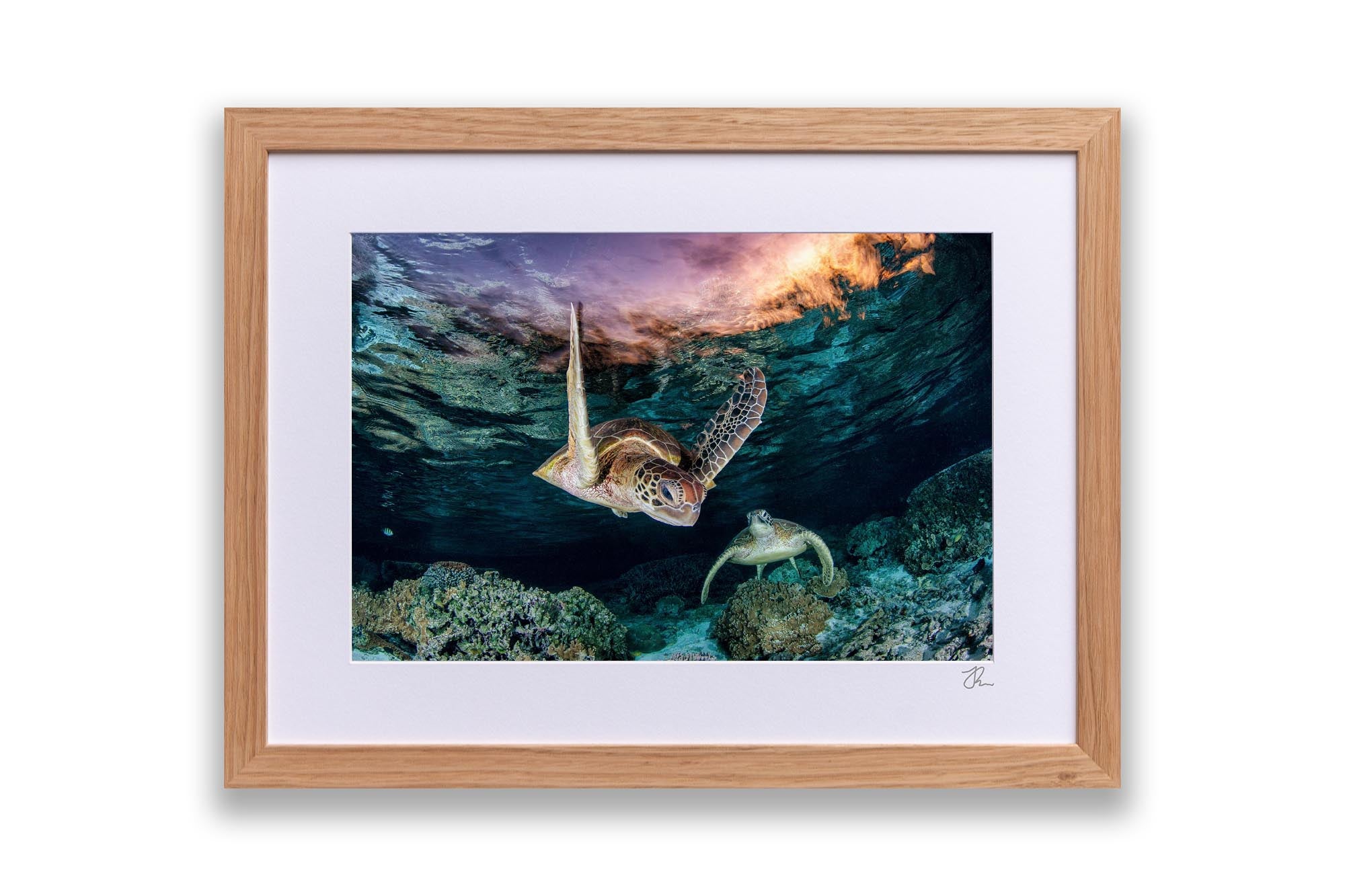 This ethereal underwater photography print captures two endangered Green Sea Turtles (Chelonia mydas) gliding over vibrant coral gardens in the twilight hues of Lady Elliot Island’s lagoon, the southernmost gem of Queensland’s UNESCO World Heritage-listed Great Barrier Reef. Bathed in the soft, orange-pink light of post sunset, the turtles’  movements and intricate shell patterns contrast against the reef’s dusky blues, creating a scene of serene harmony in one of Earth’s most fragile and biodiverse ecosystems.