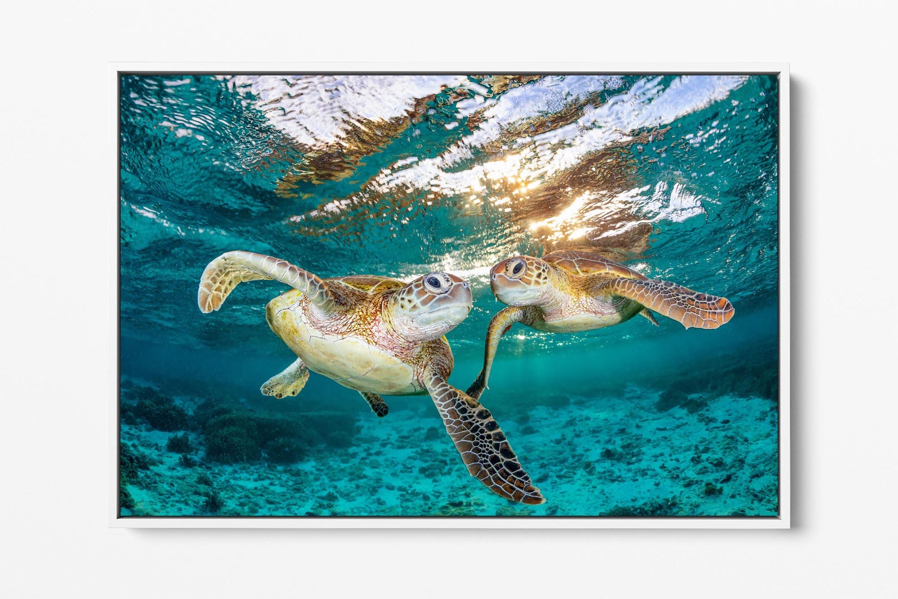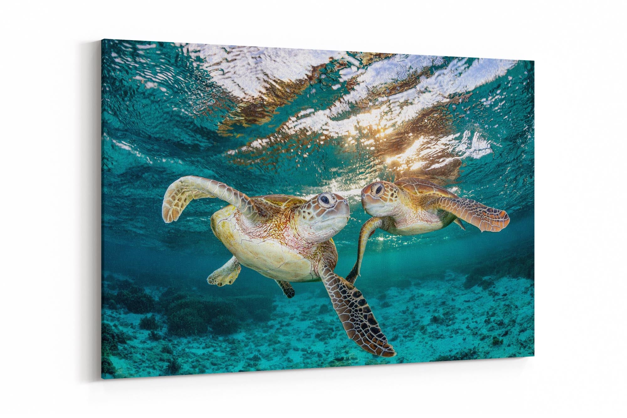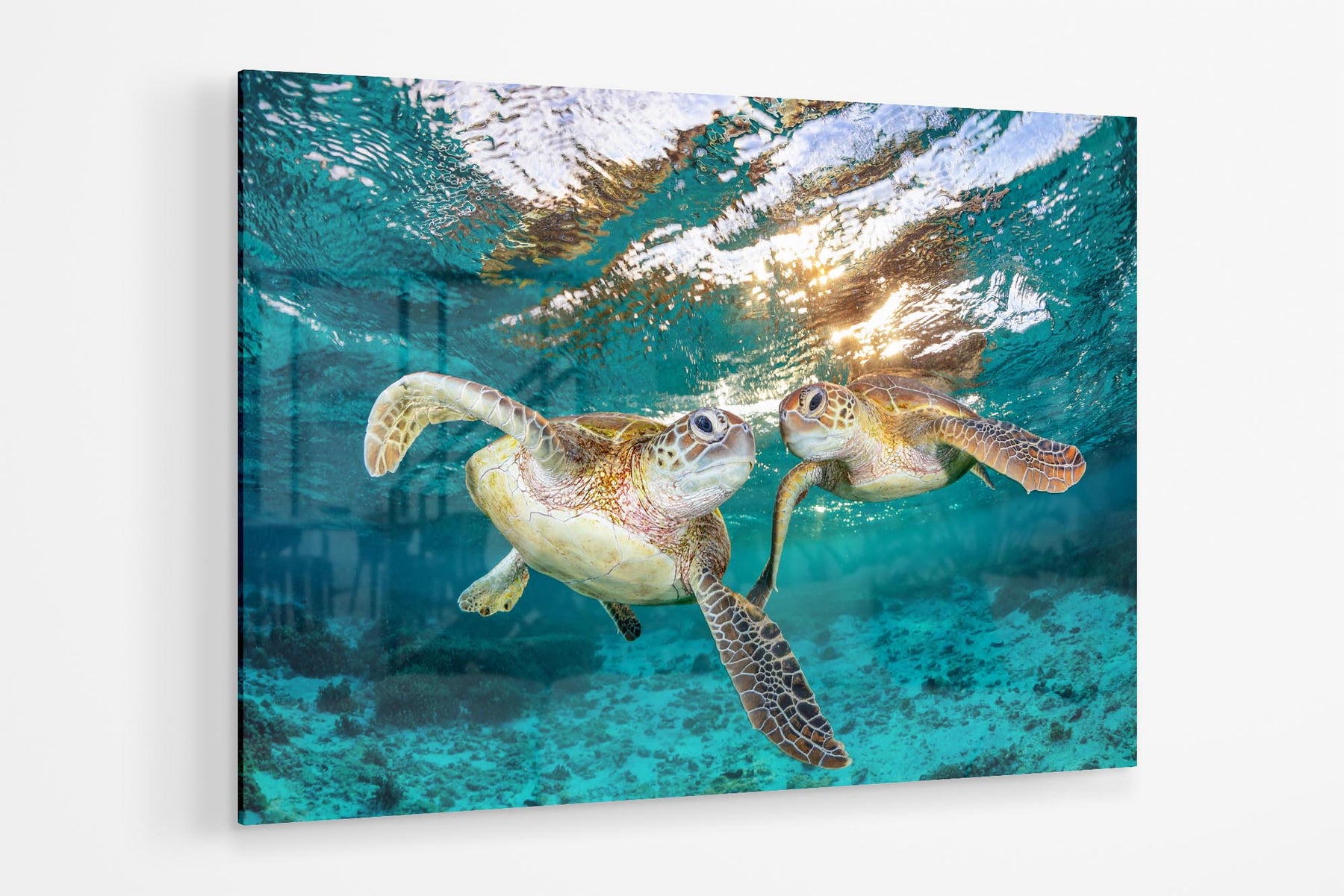 Experience the magic of the Great Barrier Reef in this breathtaking underwater photograph, featuring two endangered Green Sea Turtles gliding in harmony through the crystalline lagoon of Lady Elliot Island. Bathed in golden afternoon light that illuminates their ancient forms, this artwork from the Great Barrier Reef transforms a fleeting natural moment into a powerful statement of beauty and preservation.