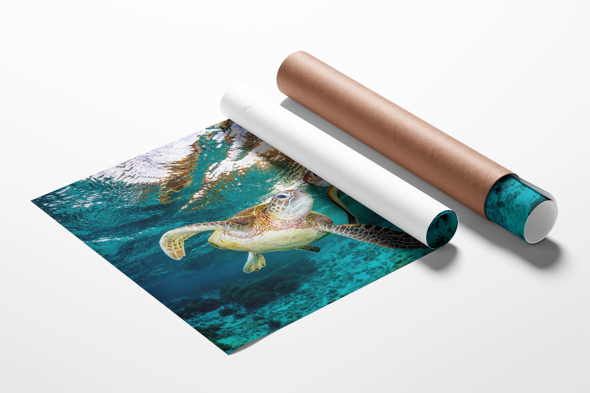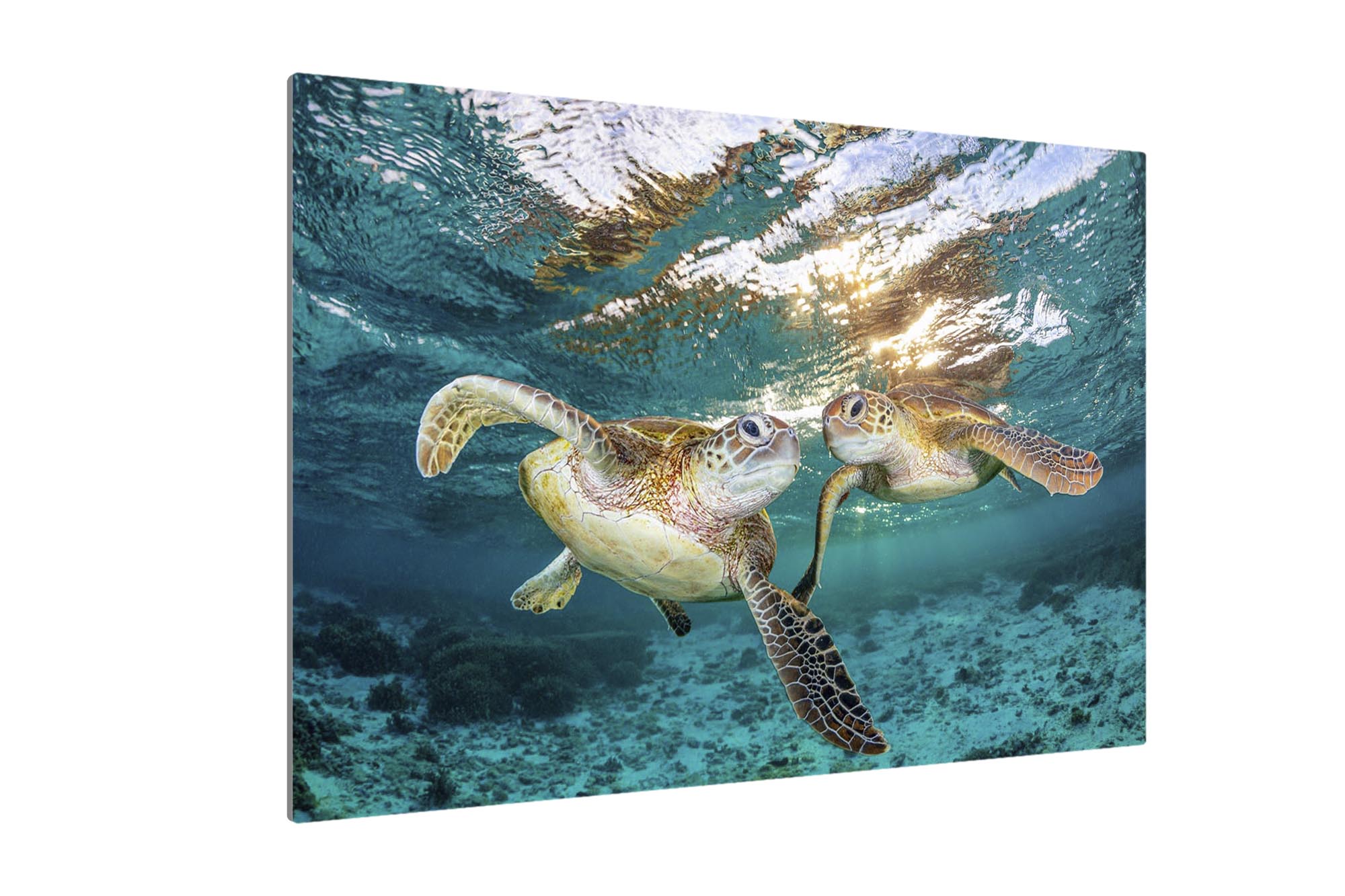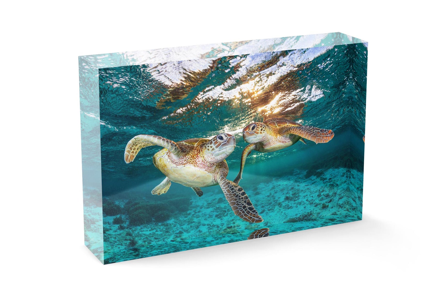 Experience the magic of the Great Barrier Reef in this breathtaking underwater photograph, featuring two endangered Green Sea Turtles gliding in harmony through the crystalline lagoon of Lady Elliot Island. Bathed in golden afternoon light that illuminates their ancient forms, this artwork from the Great Barrier Reef transforms a fleeting natural moment into a powerful statement of beauty and preservation.