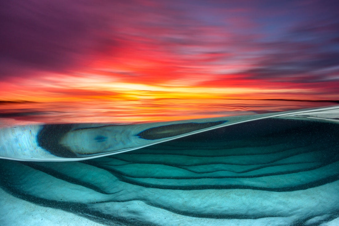 An over under photo of a vivid sunrise captured in the Water at Hyams Beach, Jervis Bay.